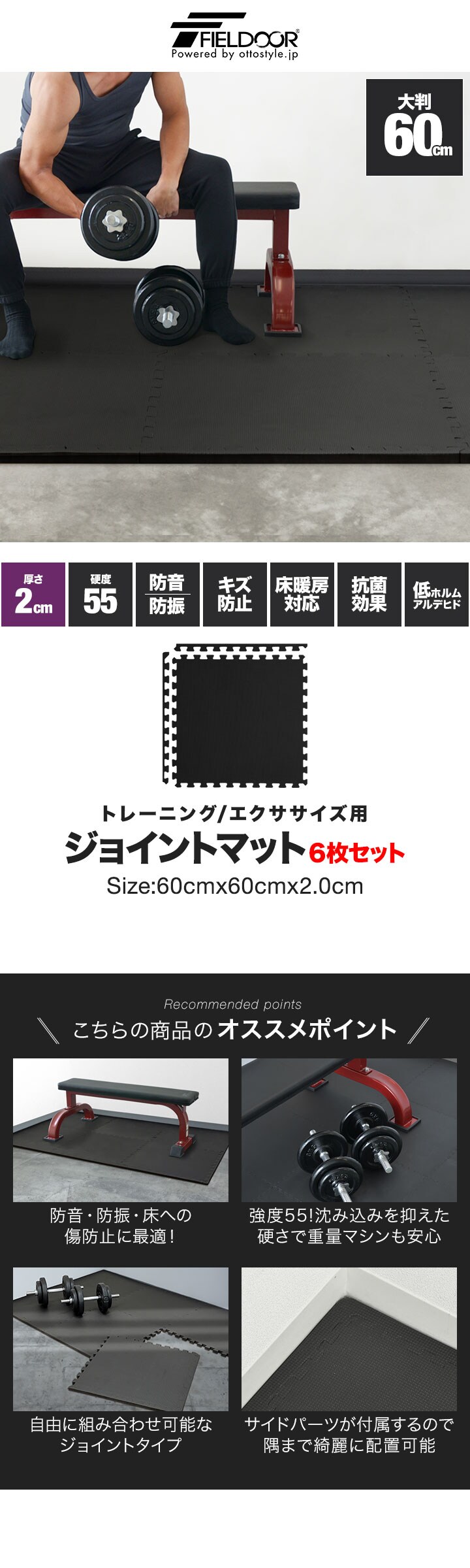 FIELDOOR トレーニングマット 筋トレ マット 大判 60cm 6枚組 厚手 20mm ジョイントマット 防音 防振 キズ防止 ストレッチマット フィットネスマット ヨガマット ダイエット 筋トレグッズ トレーニング/エクササイズ用ジョイントマット 送料無料