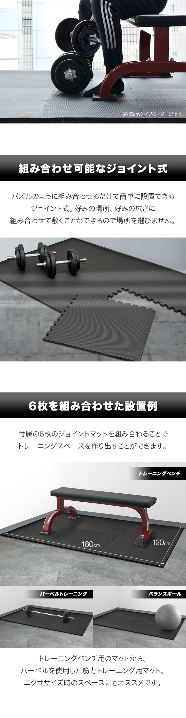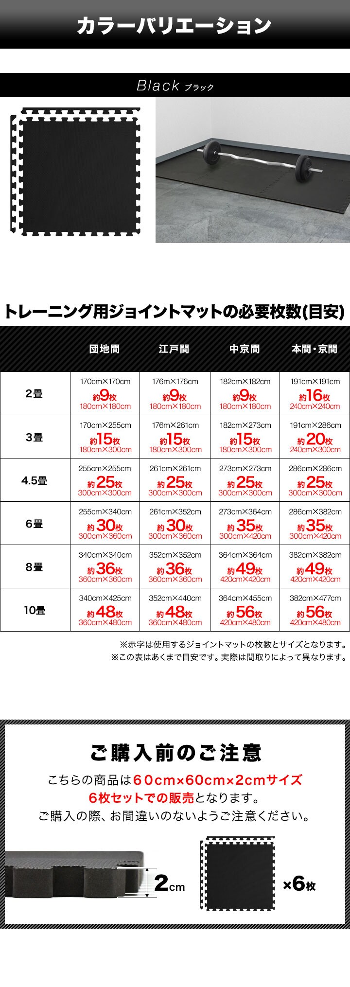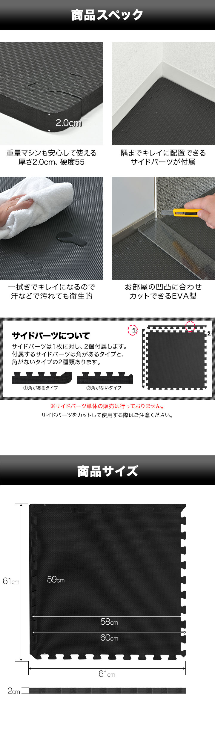 | 特記事項: ※サイドパーツ単体の販売は行っておりません。サイドパーツをカットして使用する際はご注意ください。 ※長期間の使用など、ご使用の環境によって商品の色が床材の表面に色移りする場合がありますのでご注意ください。 ※EVA樹脂の臭いが最初はある程度しますが、人体には影響ありません。臭いによる返品はお受けできませんので、臭いの気になる方はその旨をご了承の上ご購入をお願いします。 |