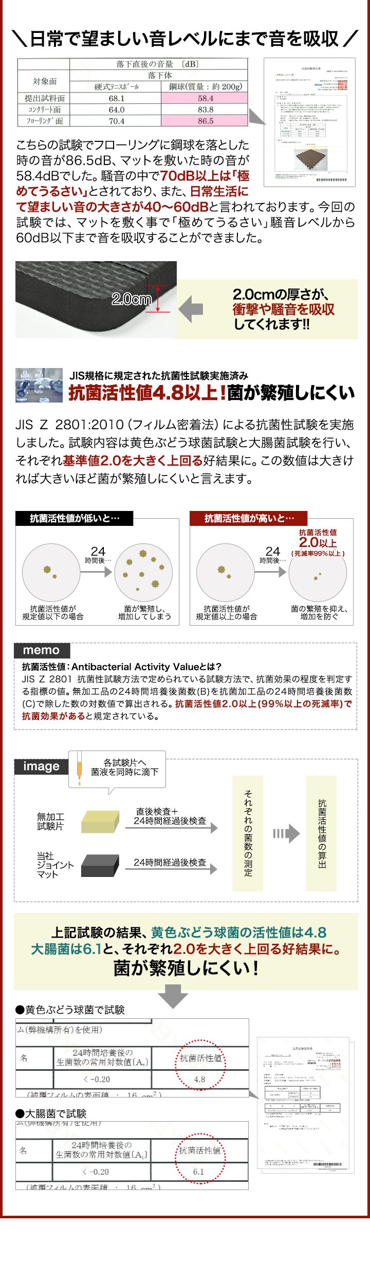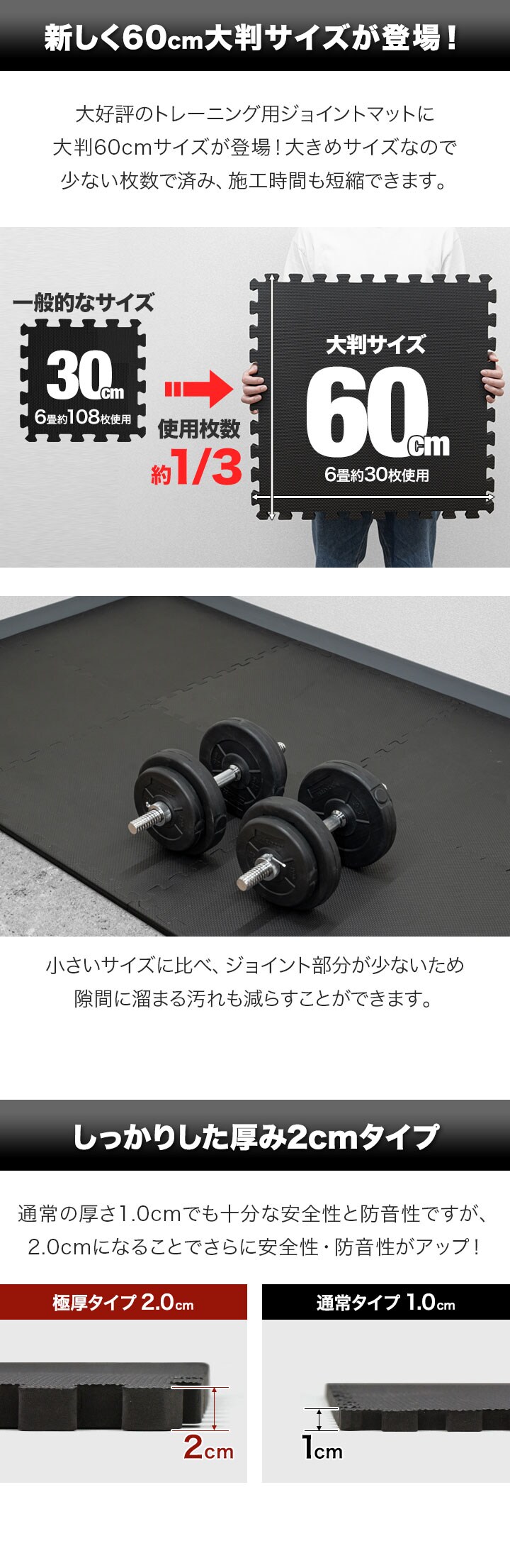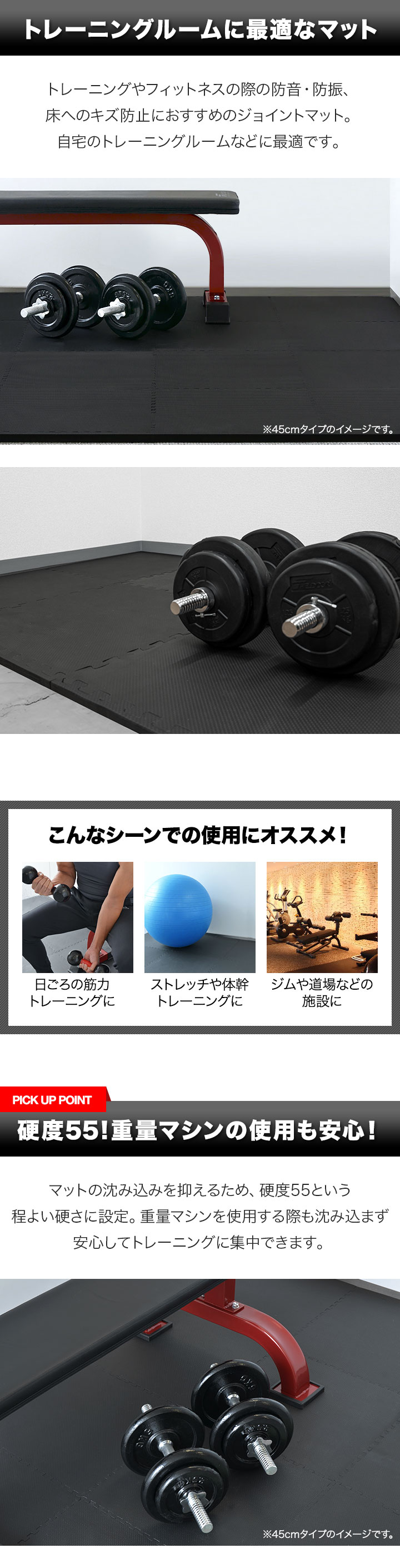 | 特記事項: ※サイドパーツ単体の販売は行っておりません。サイドパーツをカットして使用する際はご注意ください。 ※長期間の使用など、ご使用の環境によって商品の色が床材の表面に色移りする場合がありますのでご注意ください。 ※EVA樹脂の臭いが最初はある程度しますが、人体には影響ありません。臭いによる返品はお受けできませんので、臭いの気になる方はその旨をご了承の上ご購入をお願いします。 |
