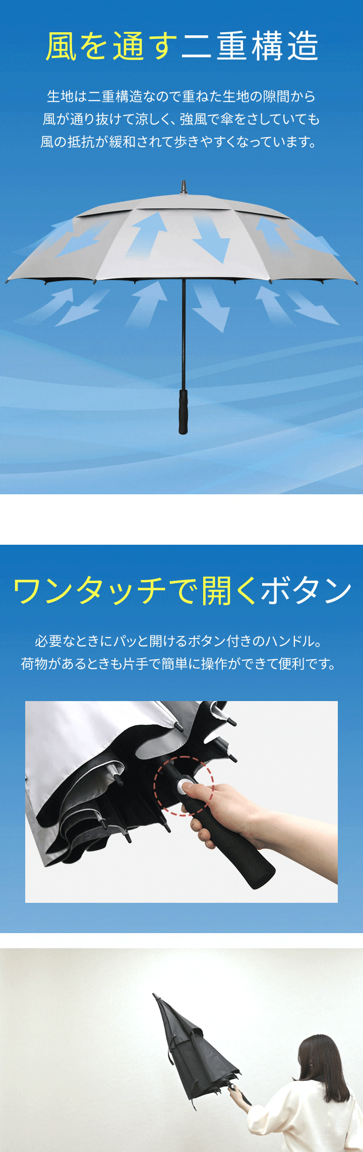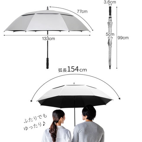 | サイズ: 親骨:(約)77cm 収納時:(約)直径5cm×長さ99cm 使用時:(約)直径133cm×長さ99cm |