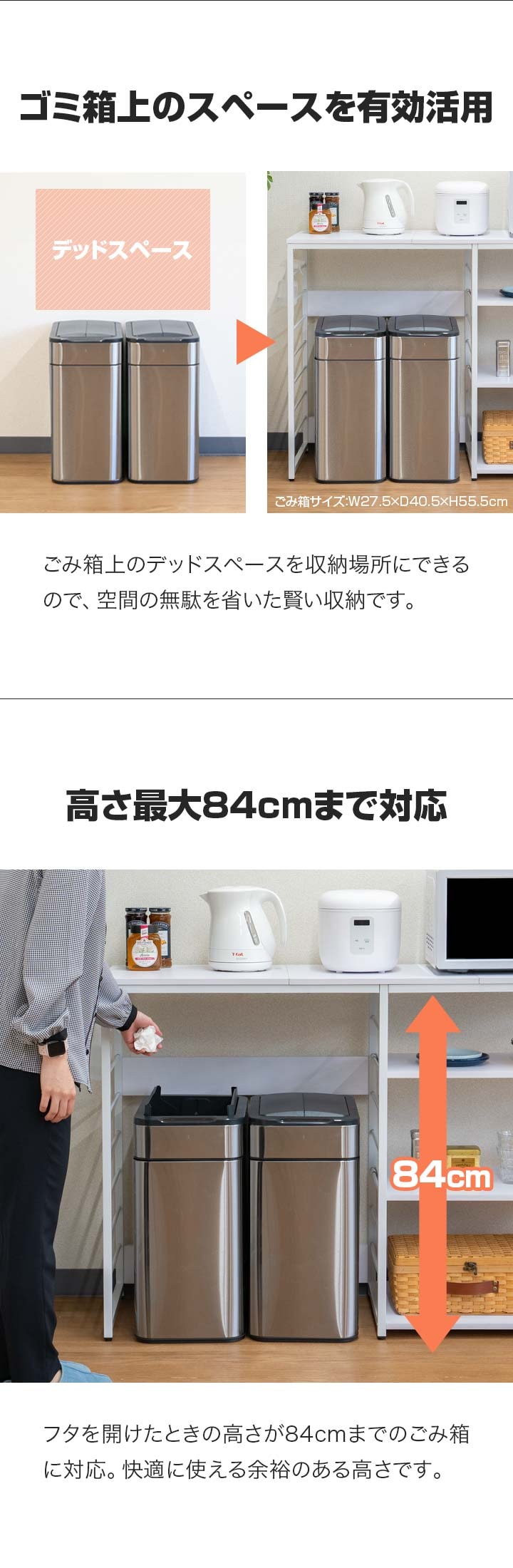 | サイズ: 本体:(約)幅135cm×奥行40cm×高さ88cm ごみ箱スペース:(約)幅64cm×奥行37cm×高さ84cm |