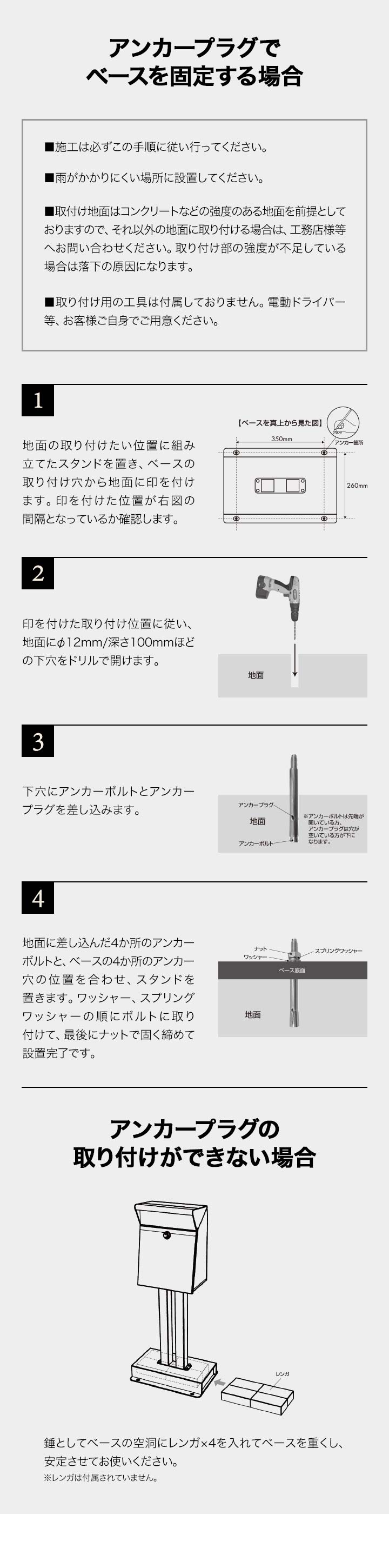 | 特記事項: ※こちらの商品はお客様組み立て品となります。(工具は付属しております) ※アンカープラグでベースを固定する場合はコンクリートなどの強度のある地面に取り付けてください。それ以外の地面に取り付ける場合は工務店様等へご相談ください。取り付け部の強度が不足している場合は倒れる原因となります。 ※アンカープラグの取り付けができない場合は錘としてベースの空洞にレンガ×4を入れてベースを重くし、安定させてお使いください。(レンガは付属されていません) |