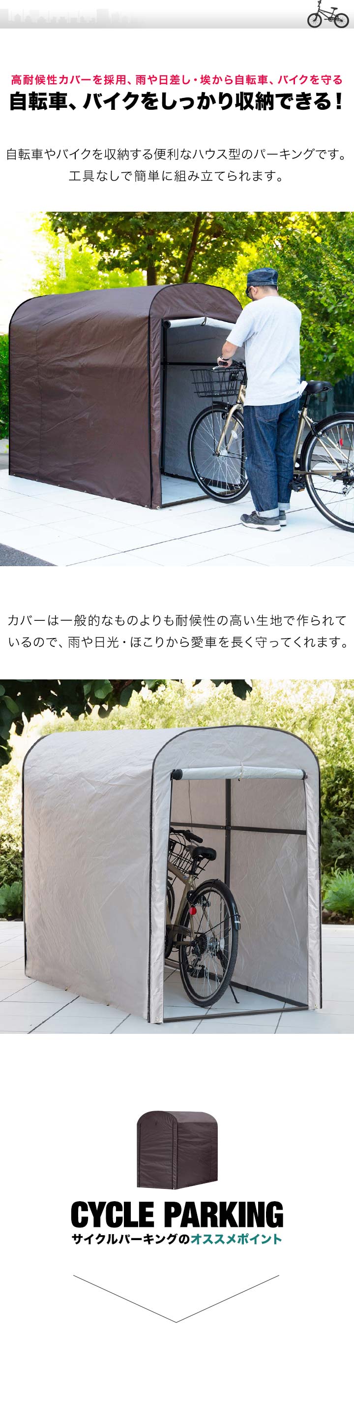 自転車やバイクを収納する便利なハウス型のパーキングです。工具なしで簡単に組み立てられます。カバーは一般的なものよりも耐候性の高い生地で作られているので、雨や日光・ほこりから愛車を長く守ってくれます。