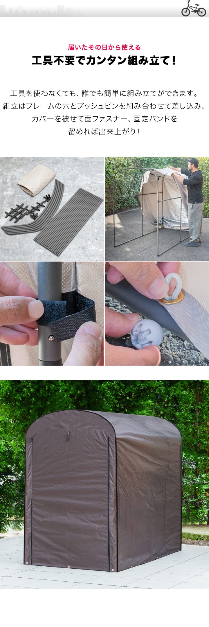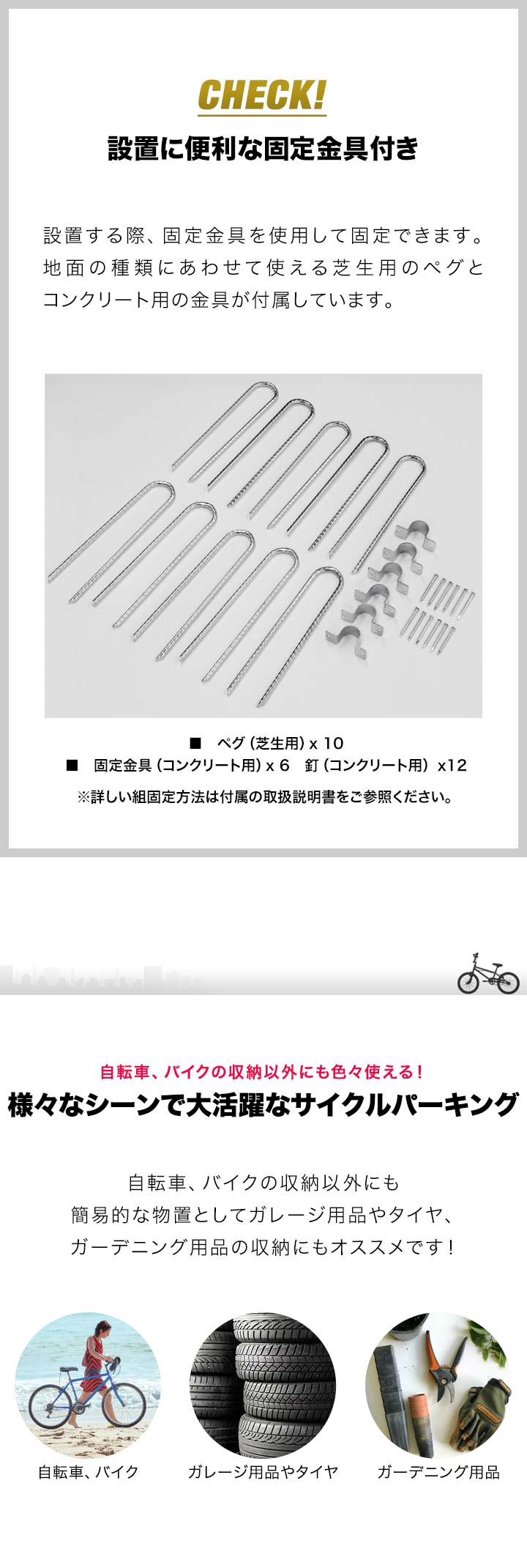 自転車、バイクの収納はもちろん、簡易的な物置や目隠しとして、ガレージ用品・タイヤ、ガーデニング用品の収納にもオススメです。