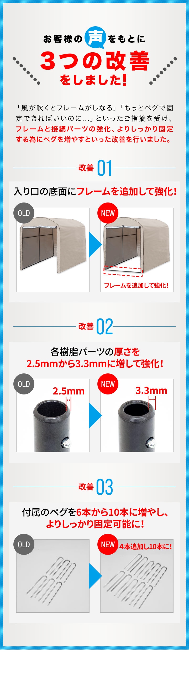 | 特記事項: ※組み立ては2人以上で行ってください。 ※台風などの強風時は使用を中止し、カバーは外してください。 風で飛ばされたり、転倒して周囲のものを破損・破壊させる原因となります。 ※固定金具を使用する場合、ペグ、釘打ちのハンマーは別途ご用意ください。 |