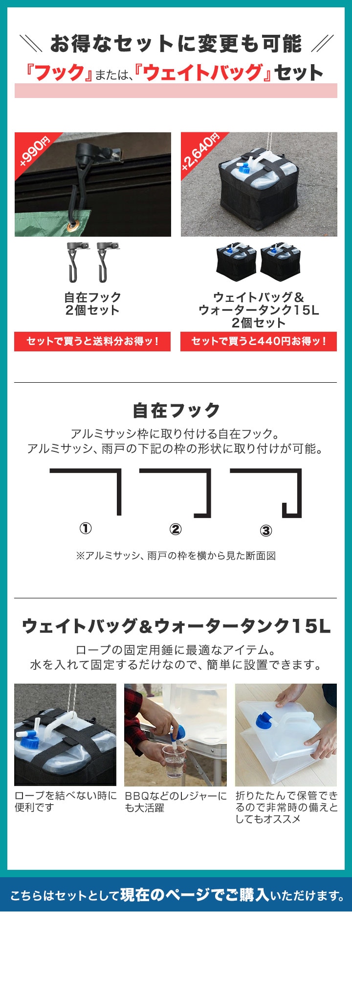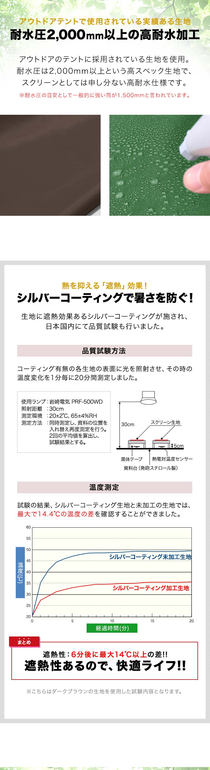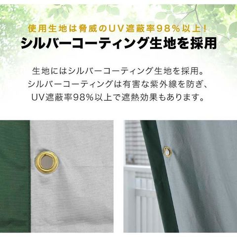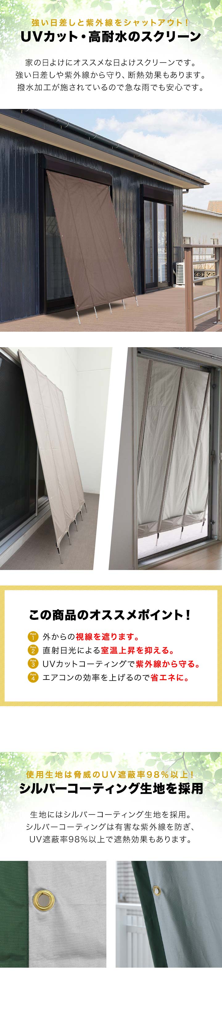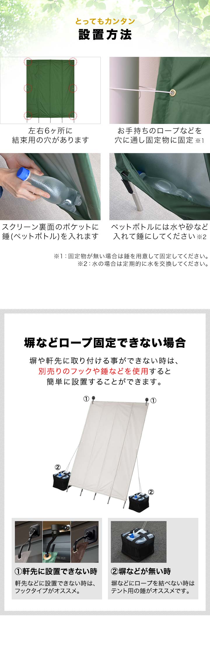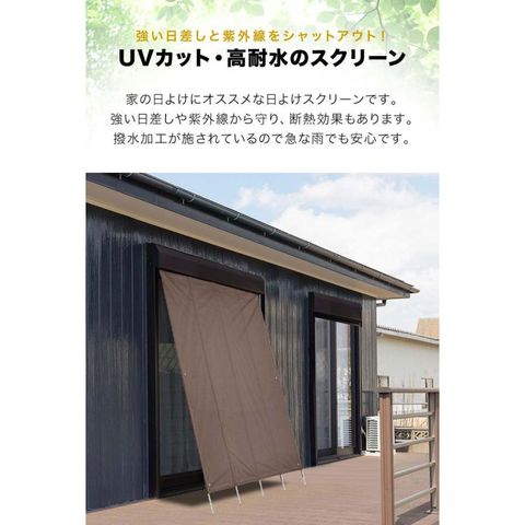 | 特記事項: ※こちらの商品にはロープ・錘は付属いたしません。 ※日よけスクリーンの設置は、必ず固定物と固定、もしくは錘で固定してください。 ※設置は安全のため2人以上で行ってください。 |