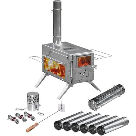 | 付属品: ・薪ストーブ本体×1 ・煙突(ダンパー付き)×1 ・煙突パイプ×6 ・スパークアレスター×1 ・灰かき棒×1 ・カラビナ×3 ・ロープ×3 ・ロストル×1 ・ふた×1 ・ガラス×1 ・取扱説明書(日本語) |