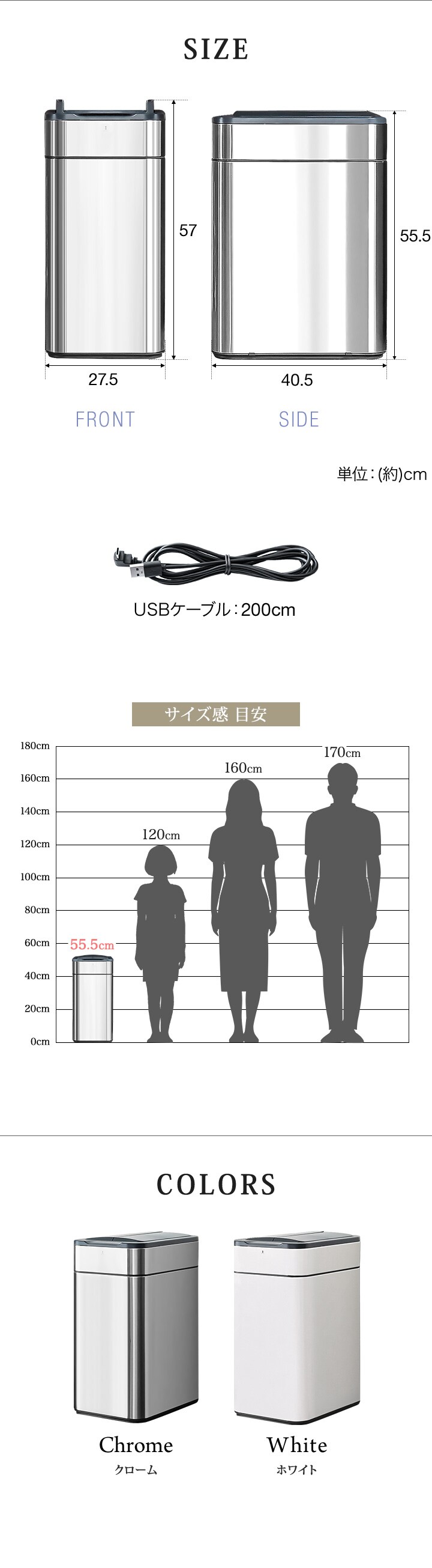 | サイズ: (約)幅27.5cm×奥行40.5cm×高さ55.5cm ※フタを開けたときの最大高さ:57cm ※USBケーブル長さ:2m(端子除く) |