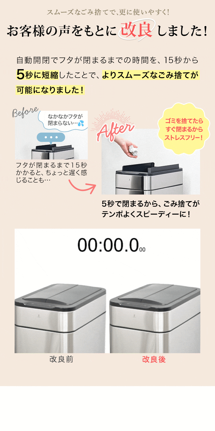 | 特記事項: ・USB出力対応のACアダプタが別途必要です。 ・製品の都合上、フタの裏側にバッテリーボックスがありますが電池での使用はできませんのでご注意ください。 ・濡れた手で本機にUSBケーブルを繋がないでください。感電や製品の誇張の原因になります。 ・設置する場所や環境により誤動作したり、動作しない場合がございます。周りに干渉するような物が無い場所にて動作の確認を行ってください。 【動作についての注意】 開閉しなくなった場合、USBケーブルがしっかりと接続されていない場合に生じる可能性があります。 USBケーブルをしっかりと接続して動作確認を行ってください。 【蓋のお手入れについての注意】 さっと水拭きして頂くだけで簡単にお掃除ができますが、水を多く含んだ状態で水拭きを行うと蓋の隙間から水が浸入し破損の原因となります。 水拭きを行う際は固く絞り、水をよく切ってから行ってください。 【設置場所についての注意】 蓋に水がかかってしまうような場所には設置しないでください。 水が蓋に入り込んでしまうと破損の原因となります。 |