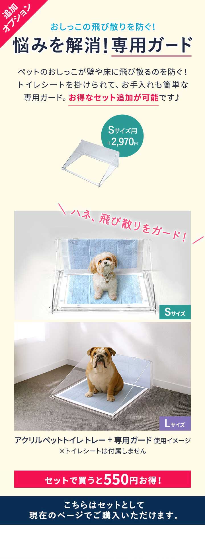 | 特記事項: ・こちらの商品は、アクリルペットトイレ トレー Sサイズ用のガードです。 ・設置する床面が濡れているとカビや汚れの原因になりますので、よく水分を拭き取ってください。 |