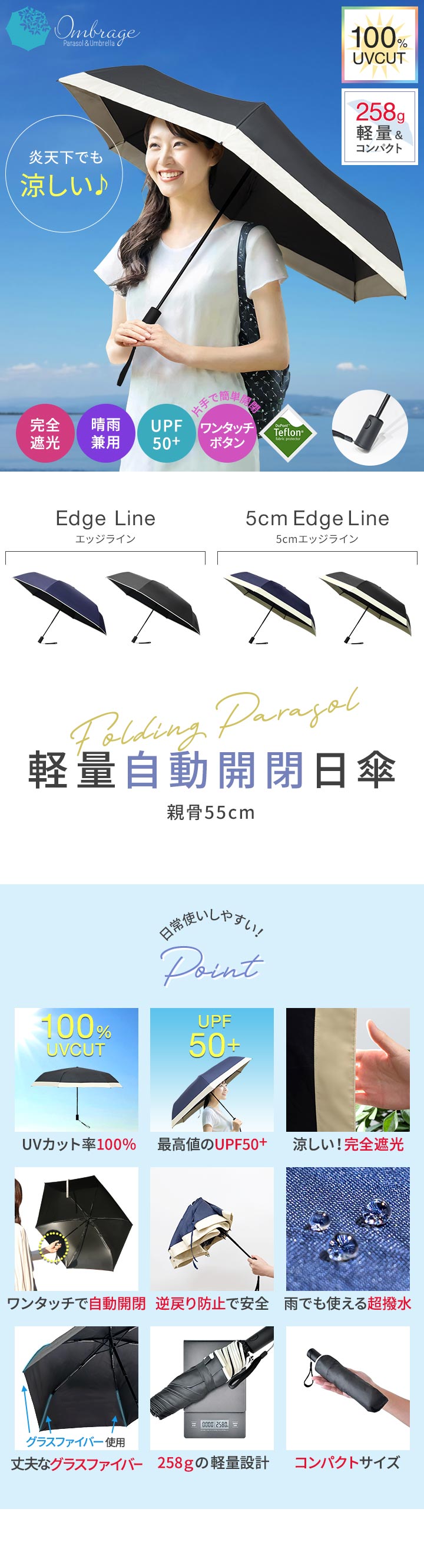 Ombrage 日傘 折りたたみ (エッジライン/ブラック) 完全遮光 軽量 親骨55cm ワンタッチ 自動開閉 UVカット100% 大きめ 遮光 遮熱 遮蔽 晴雨兼用 UPF50+ 超撥水 傘 コンパクト おしゃれ カサ 折りたたみ傘 折り畳み 男性 女性 婦人 メンズ レディース 送料無料