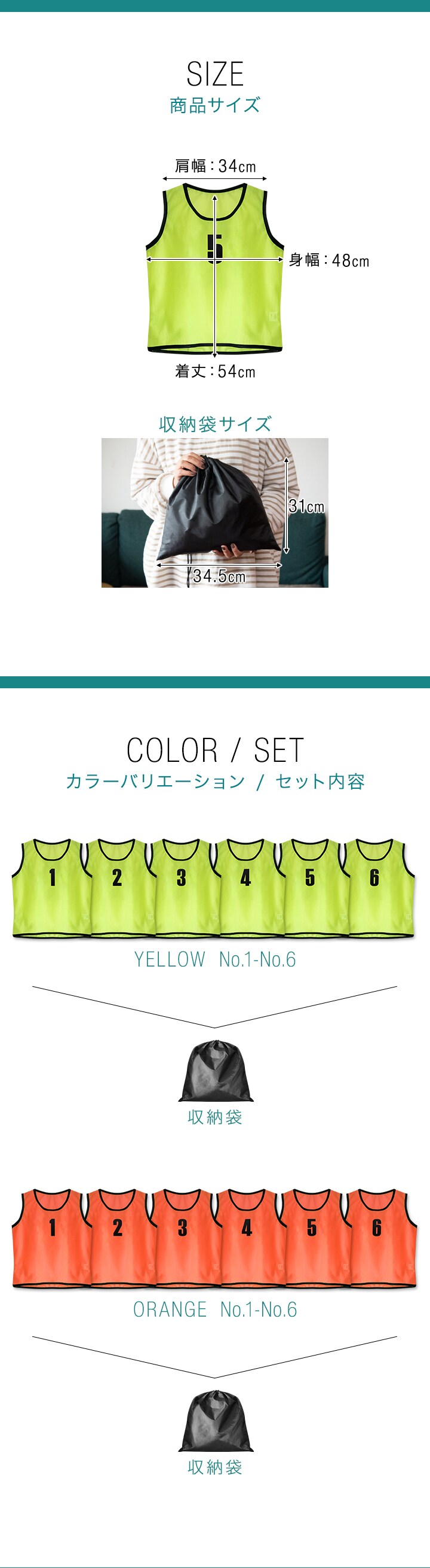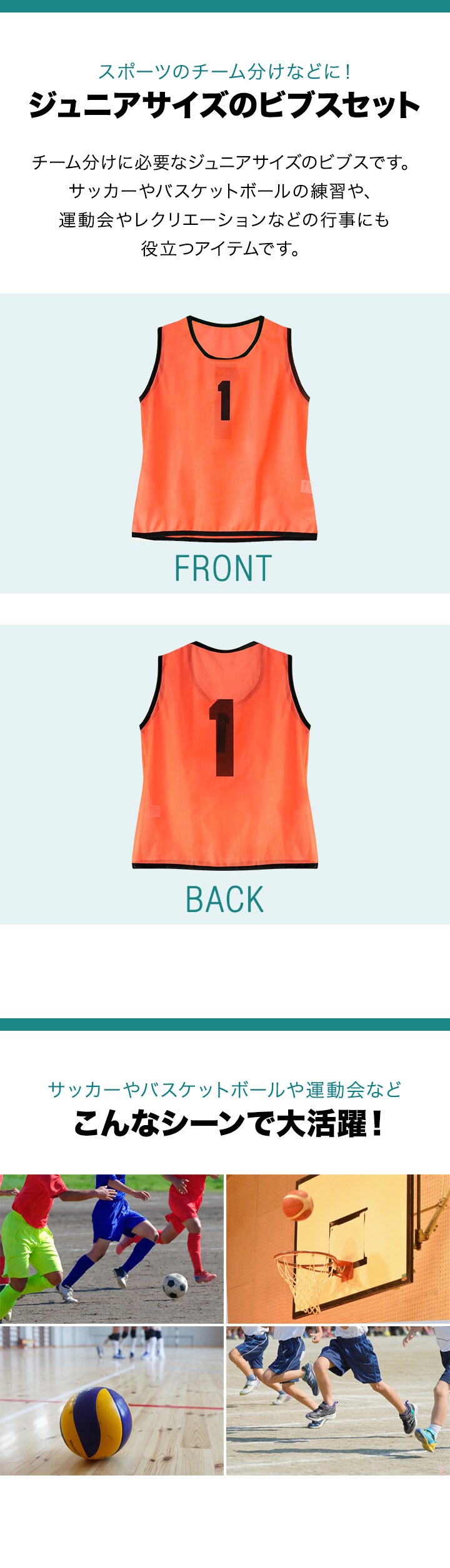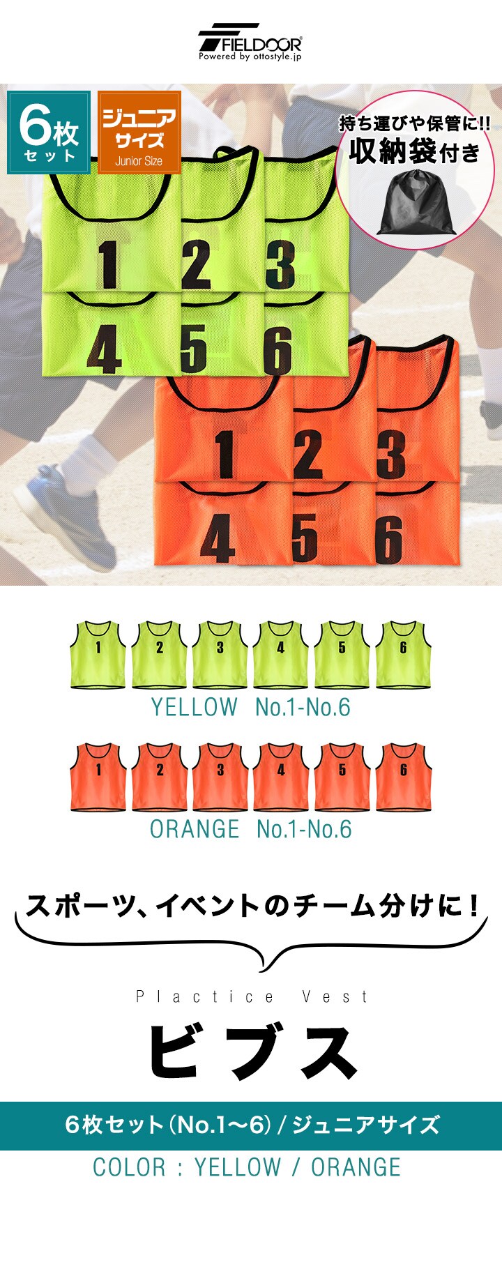 FIELDOOR ビブス 6枚セット (オレンジ) 番号入り ジュニア用 ゼッケン 1番~6番 メッシュ素材 ゲームベスト 子供用 洗える 収納袋付き サッカー フットサル バスケ バレー ミニゲーム 陸上 クラブ活動 運動会 送料無料