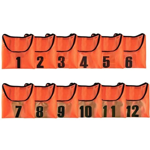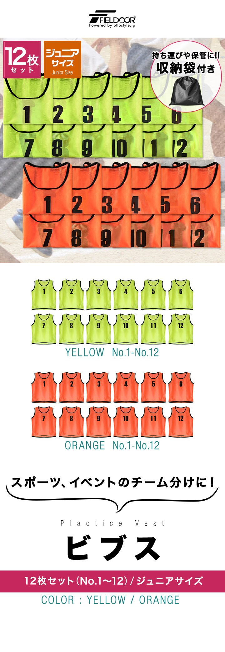 FIELDOOR ビブス 12枚セット (オレンジ) 番号入り ジュニア用 ゼッケン 1番~12番 メッシュ素材 ゲームベスト 子供用 洗濯機で洗える 収納袋付き サッカー フットサル バスケ バレー 陸上 クラブ活動 運動会 送料無料