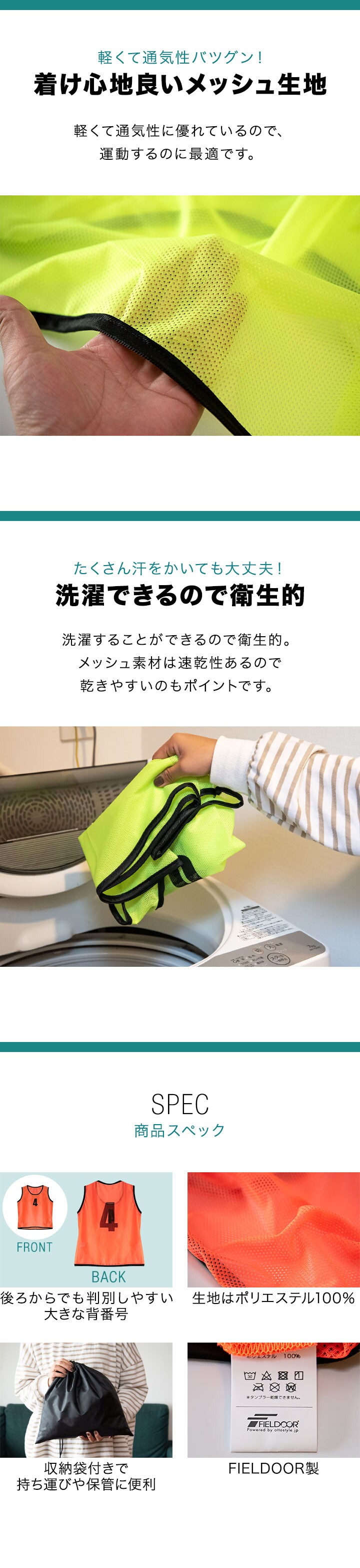 FIELDOOR ビブス 12枚セット (オレンジ) 番号入り ジュニア用 ゼッケン 1番~12番 メッシュ素材 ゲームベスト 子供用 洗濯機で洗える 収納袋付き サッカー フットサル バスケ バレー 陸上 クラブ活動 運動会 送料無料のレビュー