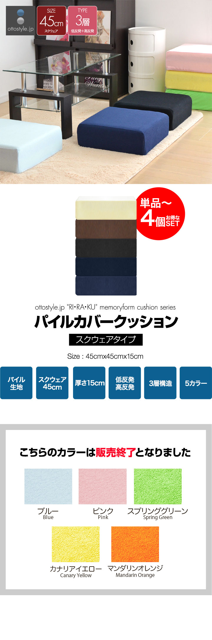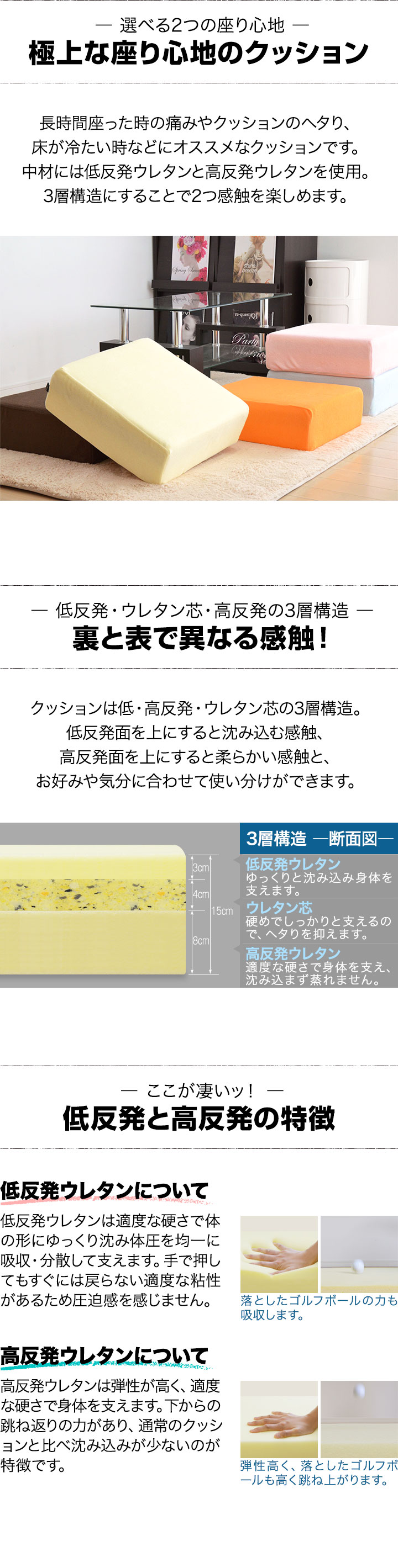 座布団 クッション 低反発 高反発 両面 3層 コンビクッション (1枚単品/スクエア/クリーミーホワイト) 45×45cm×厚手15cm 四角 洗えるパイルカバー 座ぶとん 代わり 腰 お尻に優しい フロアクッション 高さ調整 椅子用 チェア用 ざぶとん 送料無料