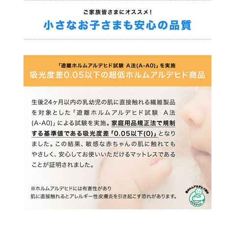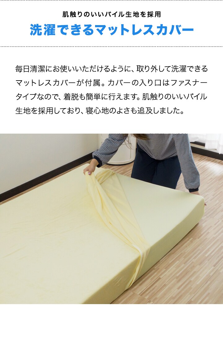 | 特記事項: ※圧縮梱包されたままの状態で長期間保管した場合、マットレスが復元できなくなってしまいます。商品到着後、1週間以内に必ず圧縮から開放をして頂くようにお願いします。 ※製品の臭いが気になりましたら、風通しの良いところで脱臭してください。この臭いは素材のウレタンによるもので無害です。臭いに敏感な方は十分ご検討の上、ご購入をお願いいたします。 ※マットの硬さは温度によって変わってきます。また、硬さの感じ方には個人差があります。 ※カバーは取り外して洗濯ができますが、マットレス本体は洗濯しないでください。 |