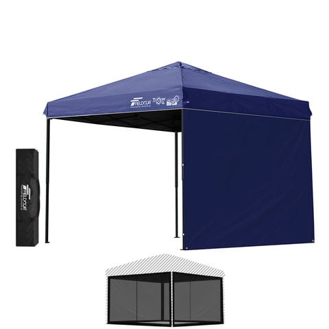 FIELDOOR ワンタッチタープテント 2.5m (遮光遮熱PU:ブルー/スチール/4点脚ロック/Bバグガード付/サイドシート1枚付) 横幕セット 頑丈 スチール タープ 250 ワンタッチテント 大型 簡単 UVカット 撥水 日よけ プール イベント アウトドア キャンプ BBQ 送料無料