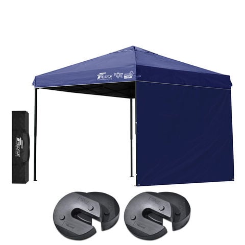 FIELDOOR ワンタッチタープテント 2.5m (遮光遮熱PU:ブルー/スチール/4点脚ロック/Dウエイト4点付/サイドシート1枚付) 横幕セット 頑丈 スチール タープ 250 ワンタッチテント 大型 簡単 UVカット 撥水 日よけ プール イベント アウトドア キャンプ BBQ 送料無料