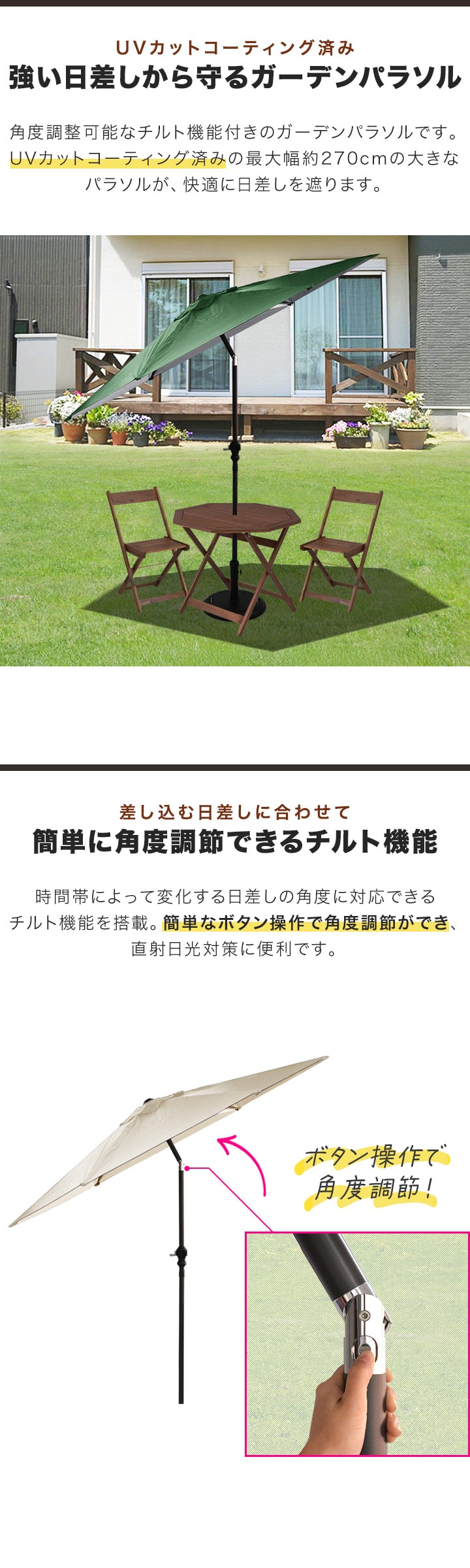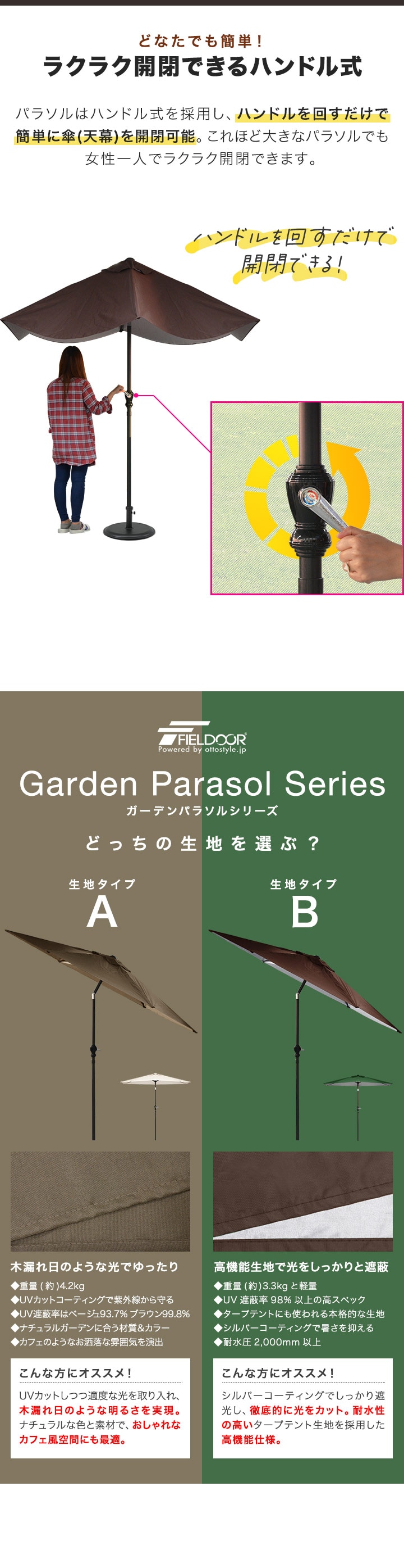 FIELDOOR ガーデンパラソル 大型 (生地タイプB:グリーン/高耐水・UVカット/パラソル本体のみ) 直径270cm 簡単 角度調整 ハンドル開閉 アルミ支柱 UVカット 高耐水 日よけ シェード 日傘 ビーチパラソル チルト機能 円形 庭 ベランダ テラス ガーデニング アウトドア 送料無料