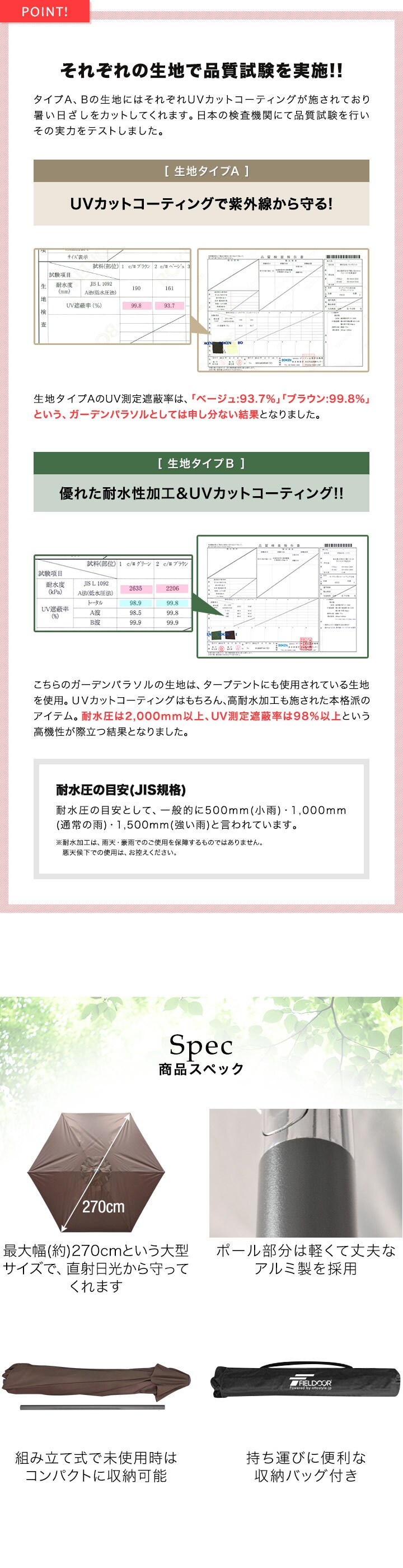 | 特記事項: ※パラソルを開く際、ハンドルを回転途中で止めずに完全に開いた事を確認してご使用ください。 ※風や雨が強い日の使用は危険ですので、ご使用しないでください。パラソルやベースを地面に固定しても突風や瞬間的な豪雨などでパラソルが破損する場合がございます。そのような自然現象による破損につきましては保証の対象外となりますのでご注意ください。 |