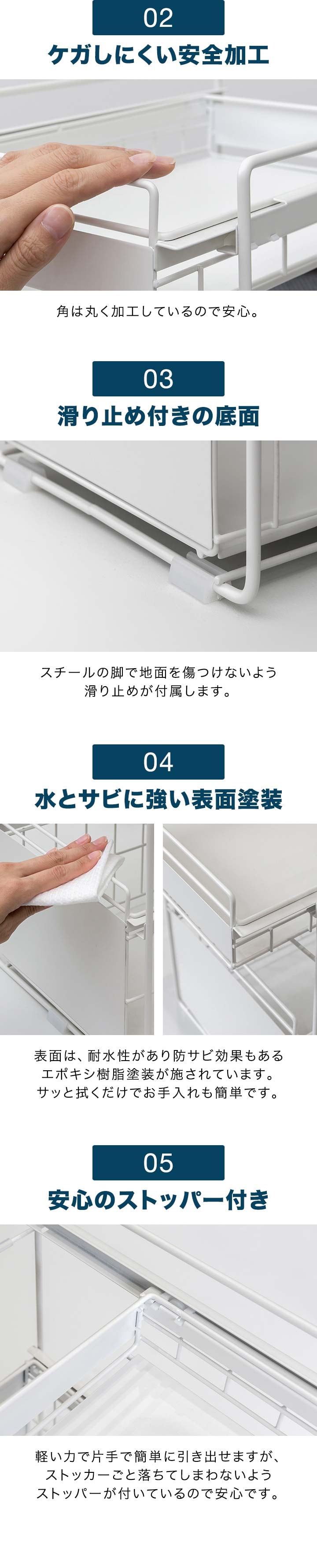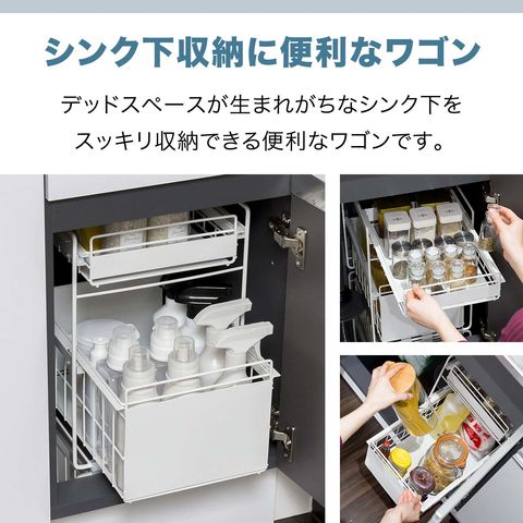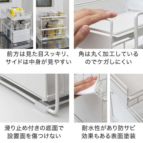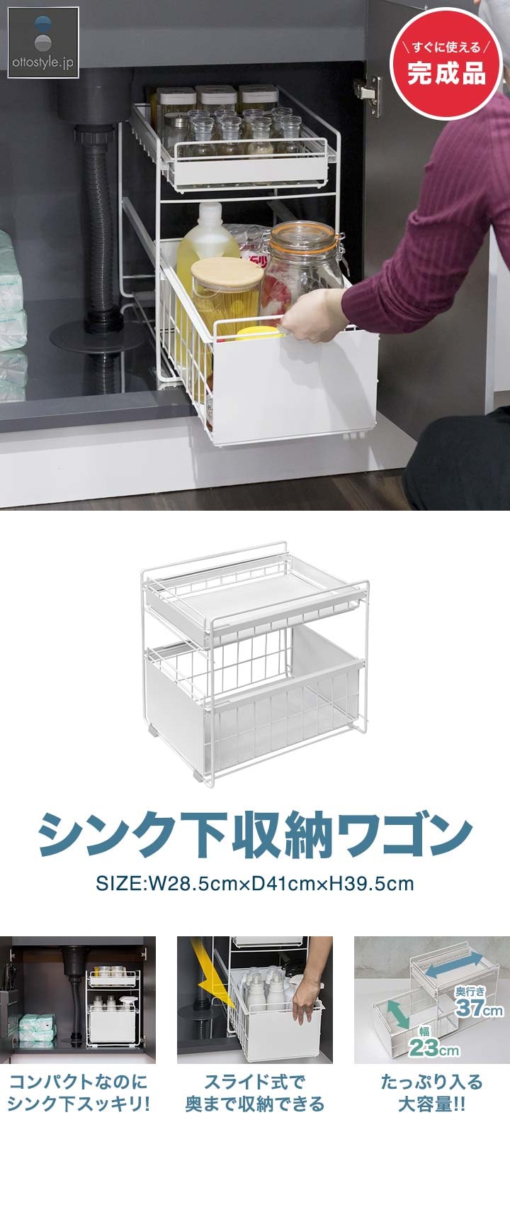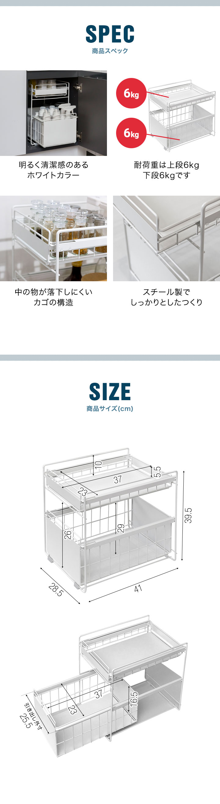シンク下 収納 ラック 引き出し スライド スリム スライドラック キッチン収納 完成品 2段 幅28.5m 棚 かご バスケット 調味料 食器 調理器具 洗面台下 キッチンラック シンク下収納ラック 収納棚 隙間収納 おしゃれ ホワイト 送料無料