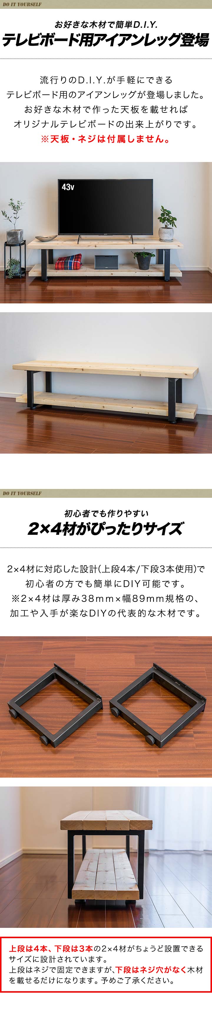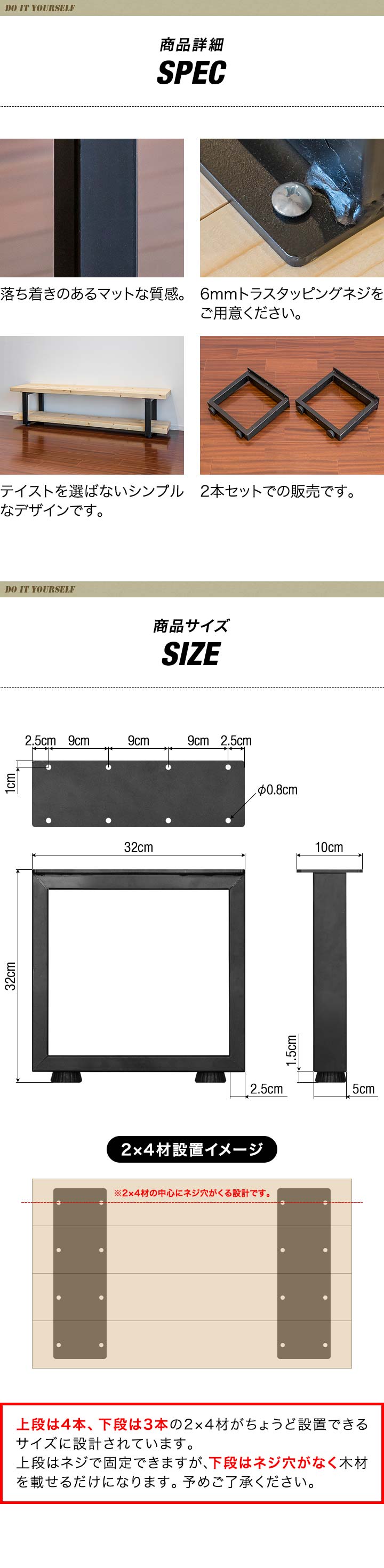 | 特記事項: ※天板・ネジは付属しません。 ※本製品とそこに載せる天板の厚みを考慮した長さのネジをご用意ください。 ※天板に下穴を開けてからネジを取り付けてください。 ※天板の素材や大きさ・厚み等によって耐荷重は異なります。 ※上段は4本、下段は3本の2×4材がちょうど設置できるサイズに設計されています。 ※下段はネジ穴がなく木材を載せるだけになります。 |