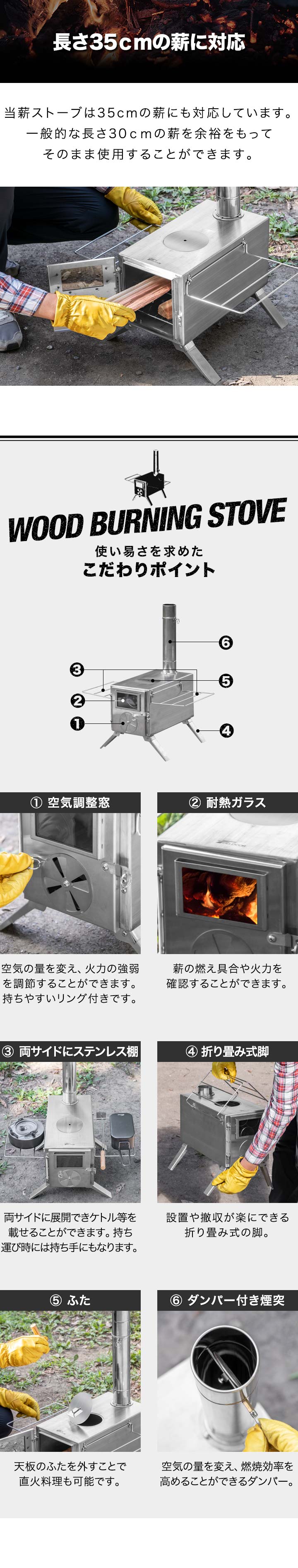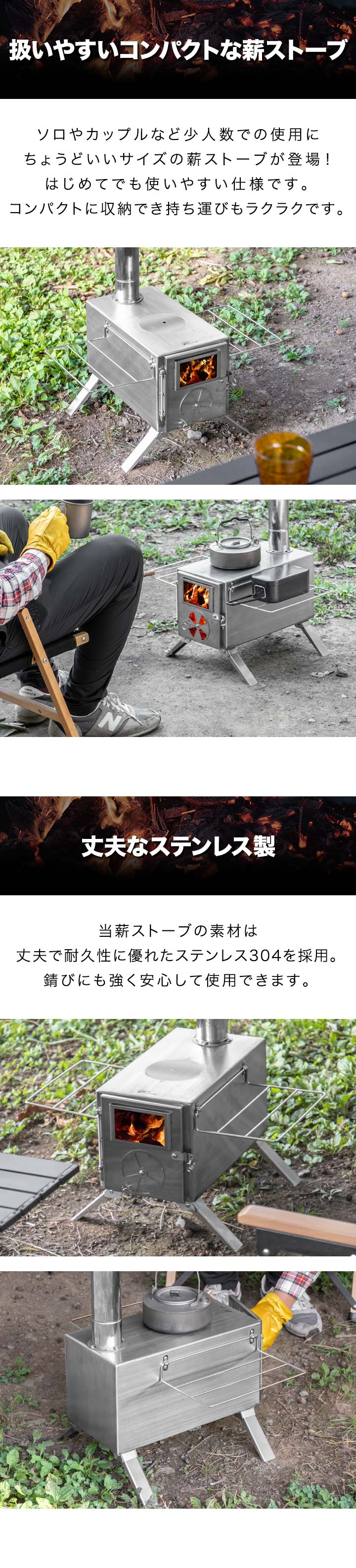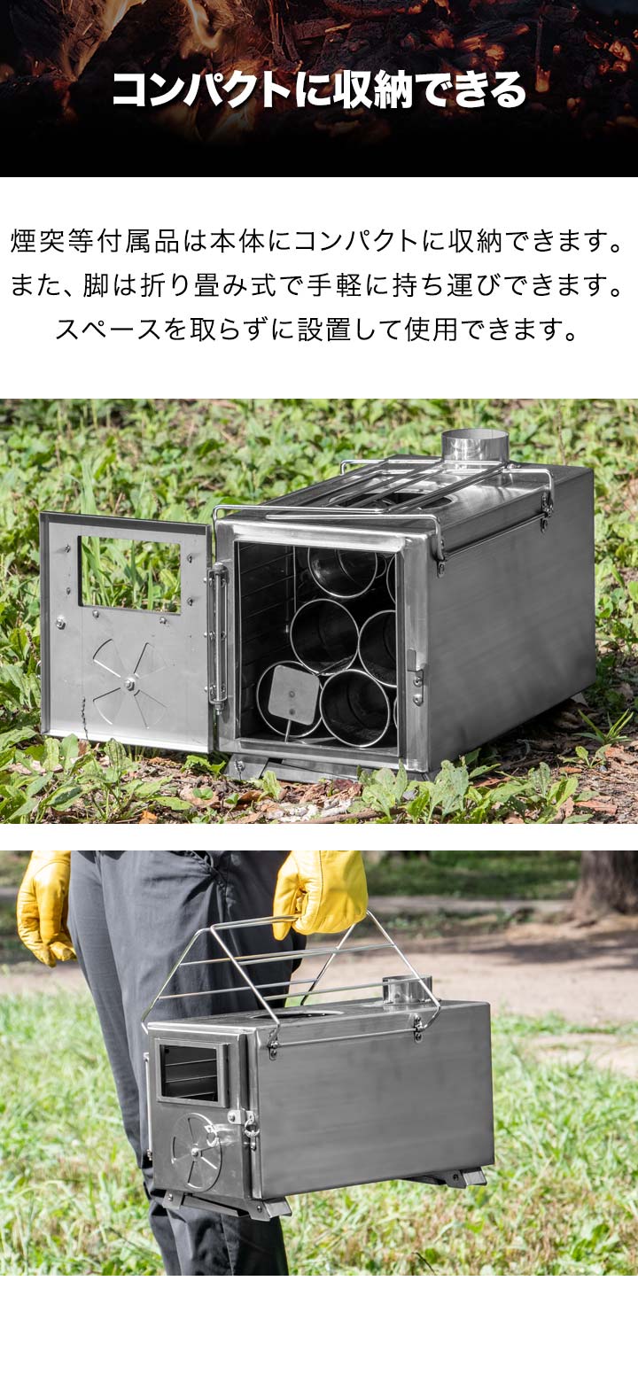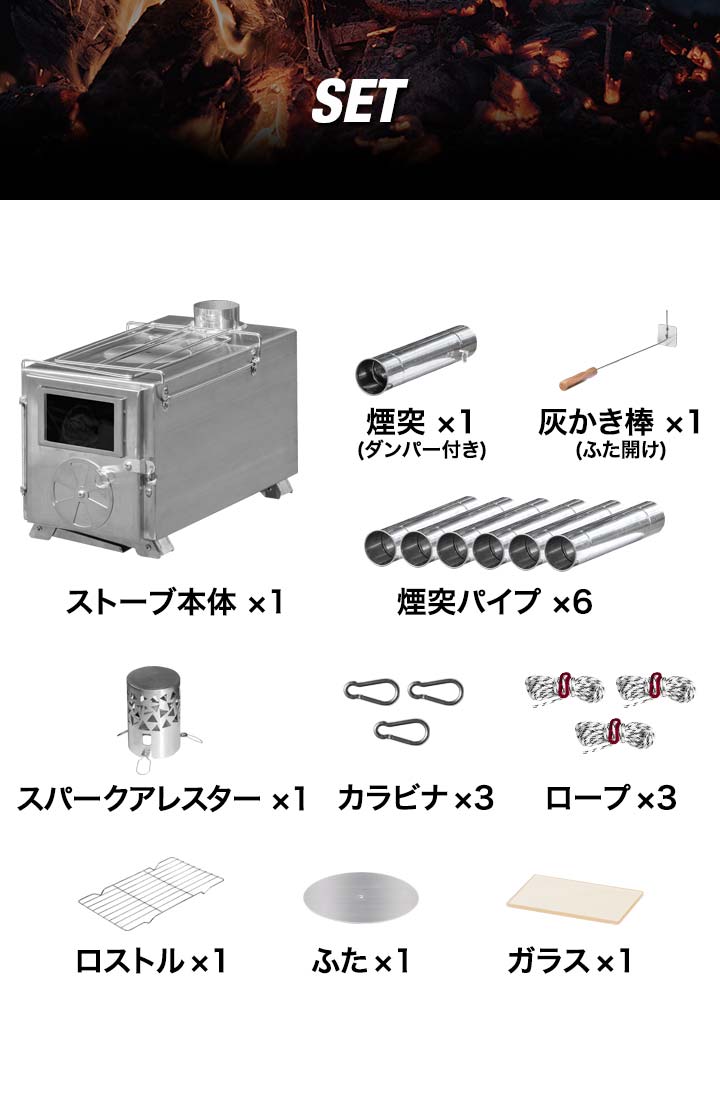 | 付属品: ・薪ストーブ本体×1 ・煙突(ダンパー付き)×1 ・煙突パイプ×6 ・スパークアレスター×1 ・灰かき棒×1 ・カラビナ×3 ・ロープ×3 ・ロストル×1 ・ふた×1 ・ガラス×1 ・取扱説明書(日本語) |