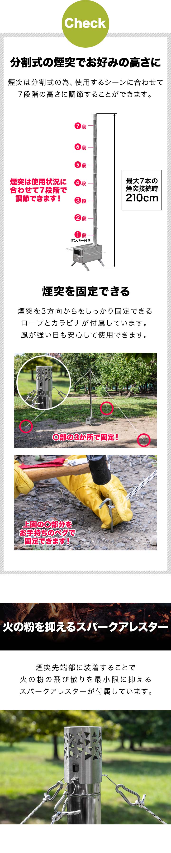 | サイズ: 組立て時:(約)幅53cm×奥行38cm×高さ210cm(煙突を最大7本接続時) 収納時:(約)幅20cm×奥行38cm×高さ25cm |