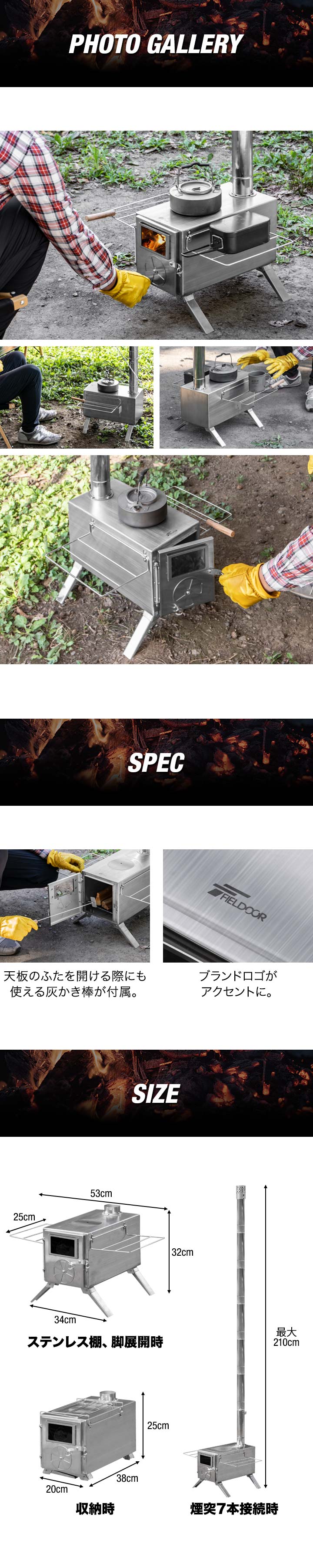 FIELDOOR キャンプ 薪ストーブ (ストーブ本体のみ) コンパクト 分割 煙突 210cm 折りたたみ 棚付き 軽量 ステンレス304 角型 小型 キャンプストーブ ミニストーブ 二次燃焼 暖房 料理 冬キャンプ 焚き火 コンロ ソロキャンプ アウトドアストーブ 送料無料