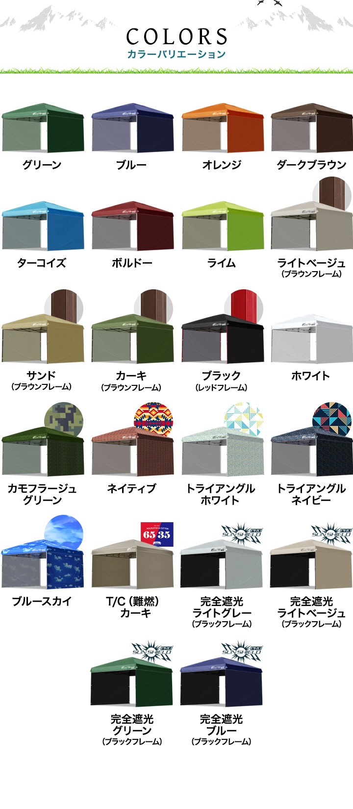 | カラー: ・グリーン ・ブルー ・オレンジ ・ダークブラウン ・ターコイズ ・ボルドー ・ライム ・ライトベージュ ・サンド ・カーキ ・ブラック ・ホワイト ・カモフラージュ/グリーン ・ネイティブ ・トライアングル/ホワイト ・トライアングル/ネイビー ・ブルースカイ ・T/C(難燃)/カーキ ・完全遮光/グレー ・完全遮光/ライトベージュ ・完全遮光/グリーン ・完全遮光/ブルー |