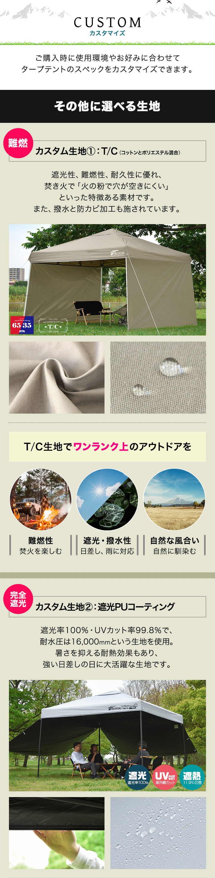 | 耐水圧: 各カラー:2,000mm以上 T/C:428mm 遮光PUコーティング:16,000mm |