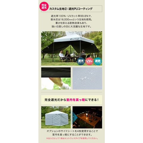 | 付属品: ・専用サイドシート(2枚) ・ロープ ・ペグ ・収納バッグ ・取扱説明書 |