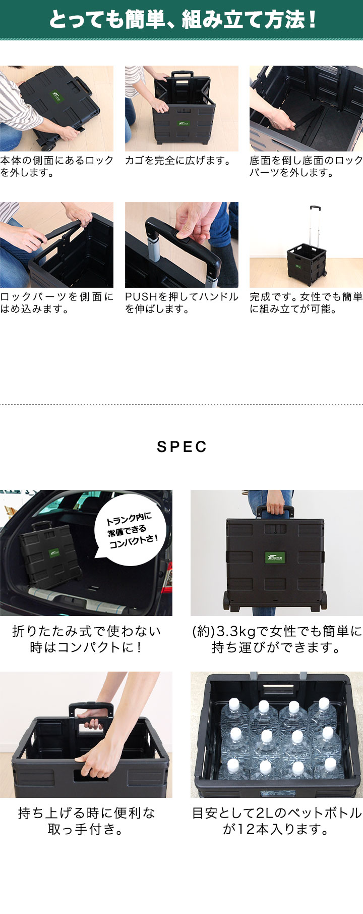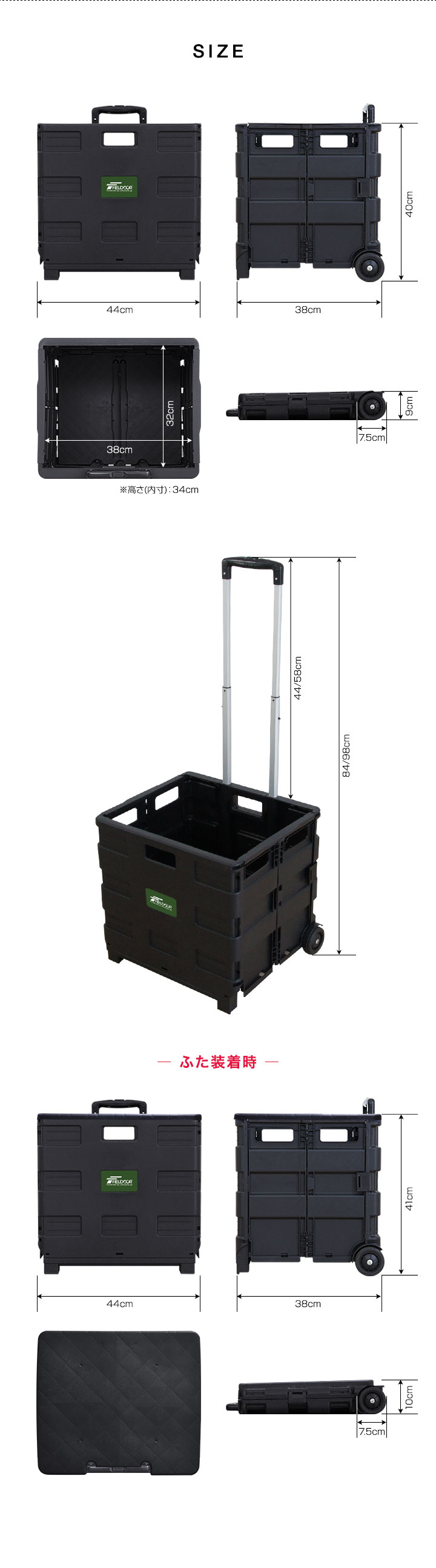 | サイズ(外寸): 組立時 : (約)W44cm×D38cm×H40cm(ハンドル含まず) (約)W44cm×D38cm×H98cm(ハンドル最長時) 収納時 : (約)W44cm×D9cm×H45cm |