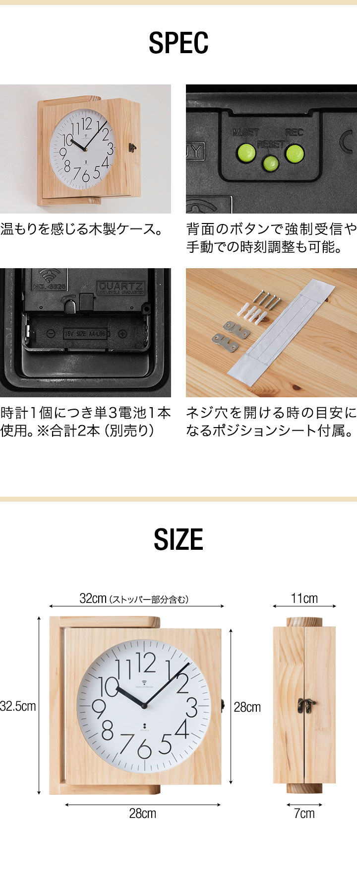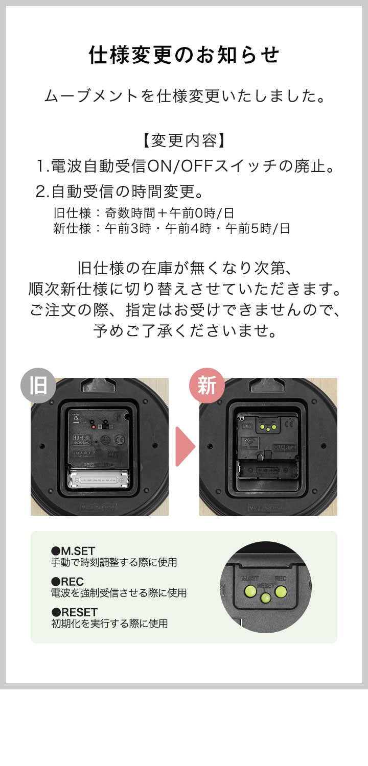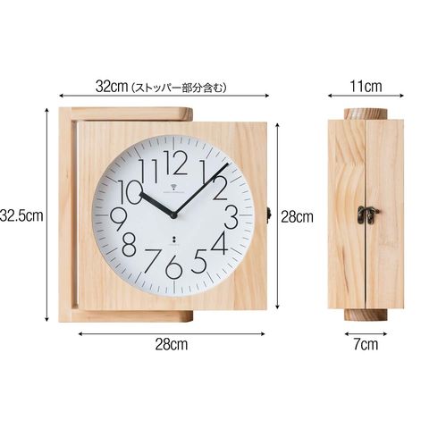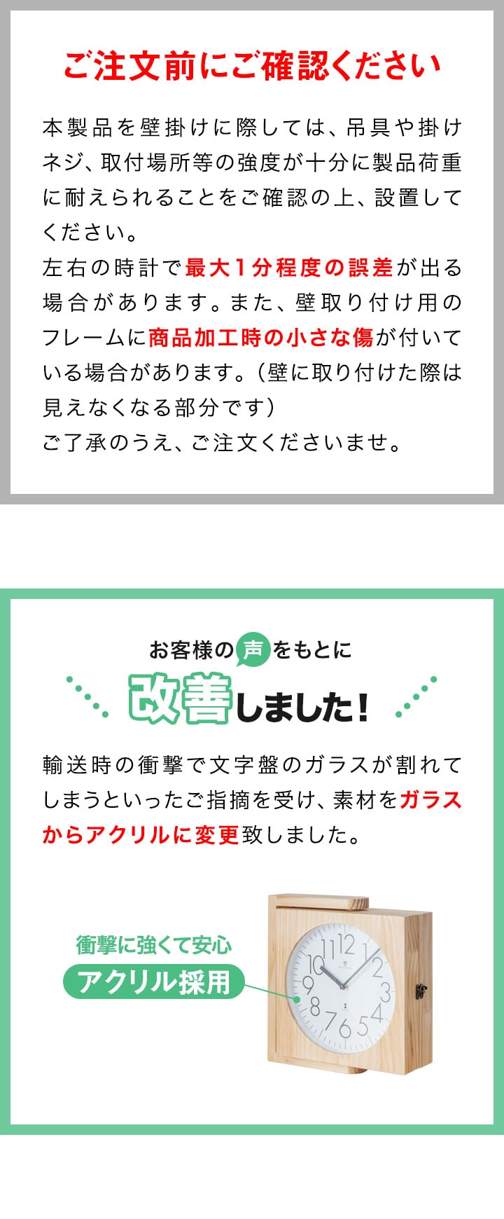 | 特記事項: ※本製品を壁掛けに際しては、吊具や掛けネジ、取付場所等の強度が十分に製品荷重に耐えられることをご確認の上、設置してください。 ※ご使用の前に必ず輸送ピンを外してください。 ※10分以上経過しても信号電波を受信できなかった場合は、電波を受信しやすい窓際で再度受信を行ってください。 ※天然素材を使用しているため、色合いや木目の出方などに個体差があります。 ※左右の時計で最大1分程度の誤差が出る場合があります。 ※壁取り付け用のフレームに商品加工時の小さな傷が付いている場合があります。(壁に取り付けた際は見えなくなる部分です) |