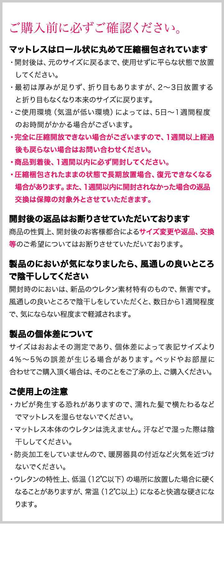 | 特記事項: ※圧縮梱包されたままの状態で長期間保管した場合、マットレスが復元できなくなってしまいます。商品到着後、1週間以内に必ず圧縮から開放をして頂くようにお願いします。 ※製品の臭いが気になりましたら、風通しの良いところで脱臭してください。この臭いは素材のウレタンによるもので無害です。臭いに敏感な方は十分ご検討の上、ご購入をお願いいたします。 ※マットの硬さは温度によって変わってきます。また、硬さの感じ方には個人差があります。 ※カバーは取り外して洗濯ができますが、マットレス本体は洗濯しないでください。 【硬さ(ニュートン)】の数値変更について 家庭用品品質表示法改正(2017年4月1日施行)に伴い、ページに表記しているマットレスの「硬さ(ニュートン)」の数値を従来の試験方法(D法)から新しい試験方法(A法)による数値に変更致しました。 ●130N(D法) ⇒ 150N(A法) ●160N(D法) ⇒ 180N(A法) ●180N(D法) ⇒ 200N(A法) ※表示する数値が変わるだけで製品自体の品質・性能は今まで通り変更ありません。 |