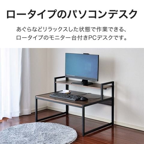 パソコンデスク ロータイプ 幅80cm (ダークブラウン/ブラック) モニター台付き 省スペース スリム 天板80×60cm PCデスク ワークデスク 作業机 書斎 勉強机 PC机 木目 おしゃれ シンプル 机 座卓 テーブル 北欧 モダン 在宅勤務 テレワーク 新生活 送料無料