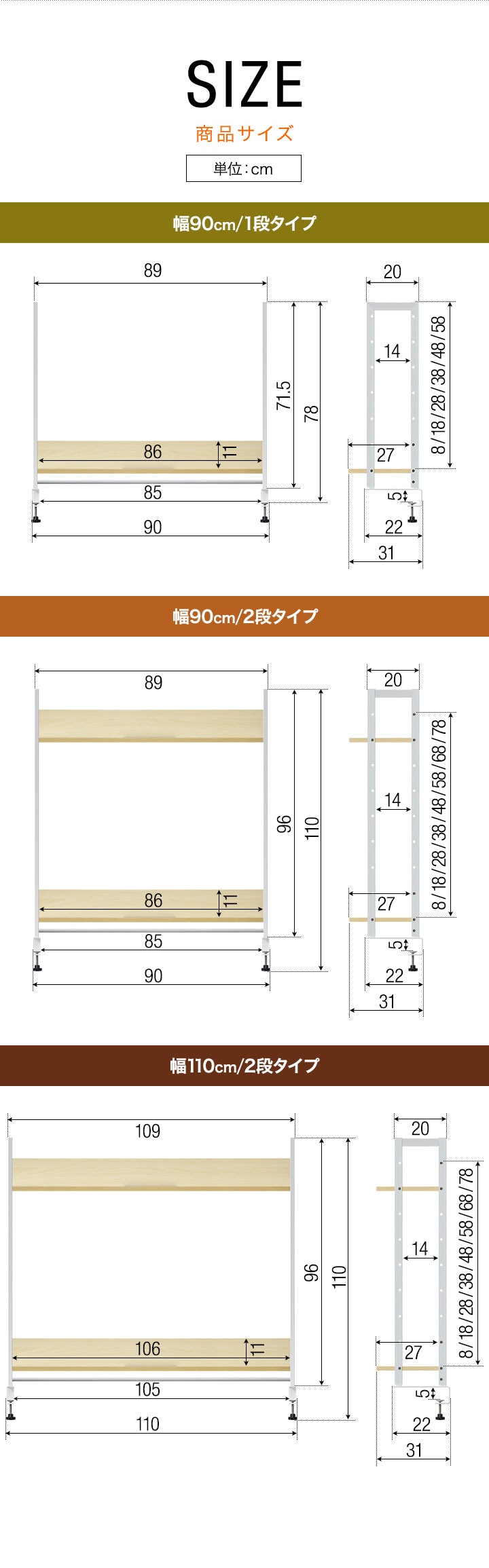 | サイズ: 【幅90cm/1段タイプ】 (約)90cm×31cm×78cm ※最大外寸 【幅90cm/2段タイプ】 (約)90cm×31cm×110cm ※最大外寸 【幅110cm/2段タイプ】 (約)110cm×31cm×110cm ※最大外寸 |