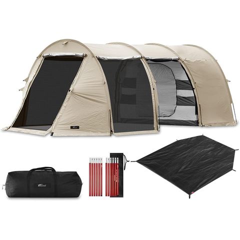 FIELDOOR テント 大型 (ライトベージュ/Eセット) ドームテント 620cm×260cm 2ルームテント 4人用 6人用 8人用 トンネルテント 620 耐水 遮熱 UVカット シェルター キャンプテント メッシュ ツールームテント インナーテント付き 前室 日よけ キャンプ 送料無料