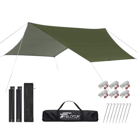 FIELDOOR タープテント ヘキサタープ (カーキ:標準/本体&スチールポール2組セット) 大型 Lサイズ 530cm×570cm 6人~8人用 日よけ 六角形 UVカット 高耐水 簡易テント サンシェード オーニング コンパクト アウトドア BBQ キャンプ 送料無料