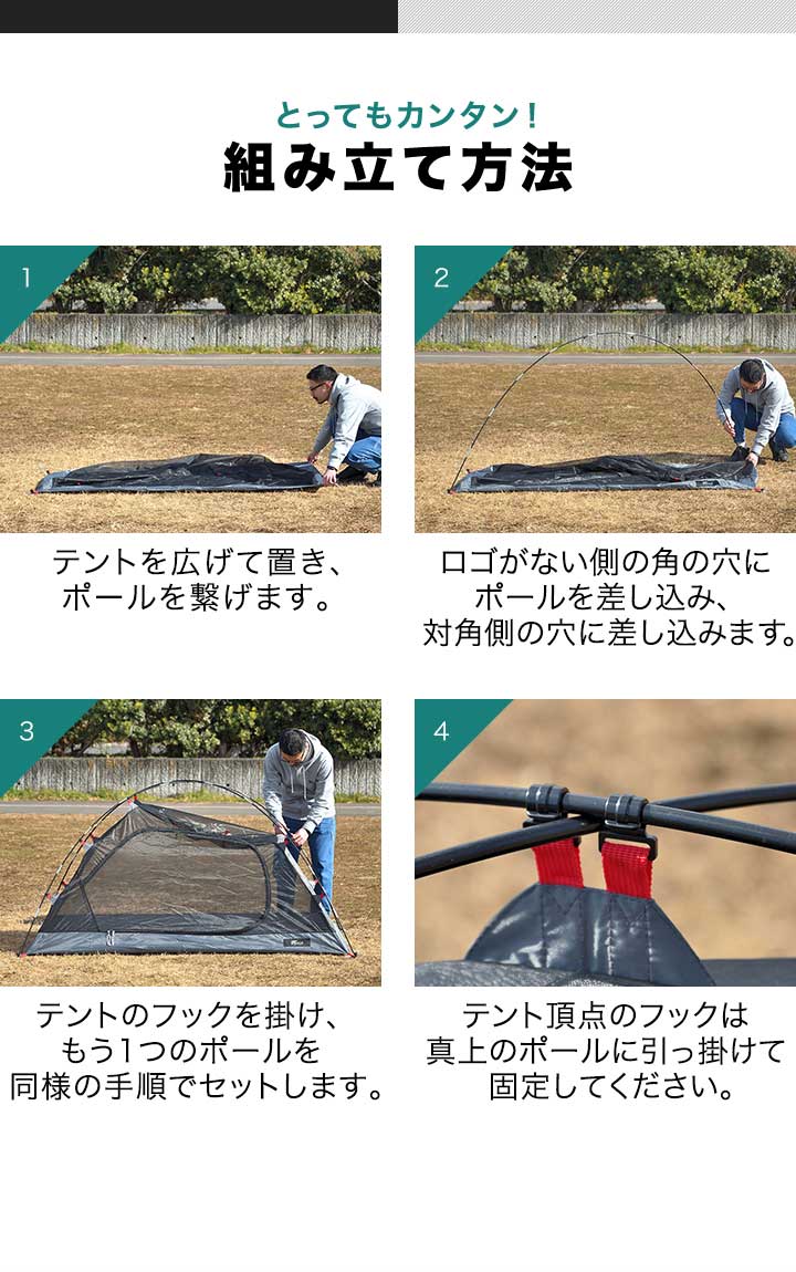 | 特記事項: ・テント本体×1 ・テントポール×2 ・専用収納バッグ×1 ・取扱説明書(日本語) |