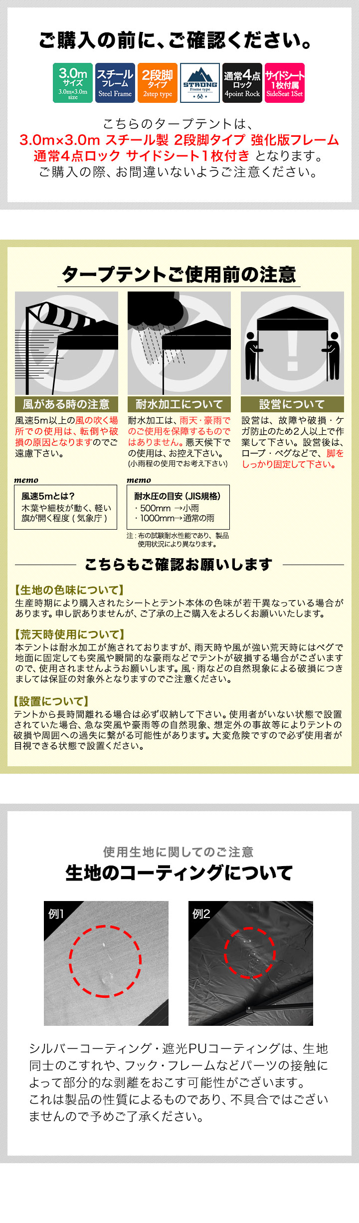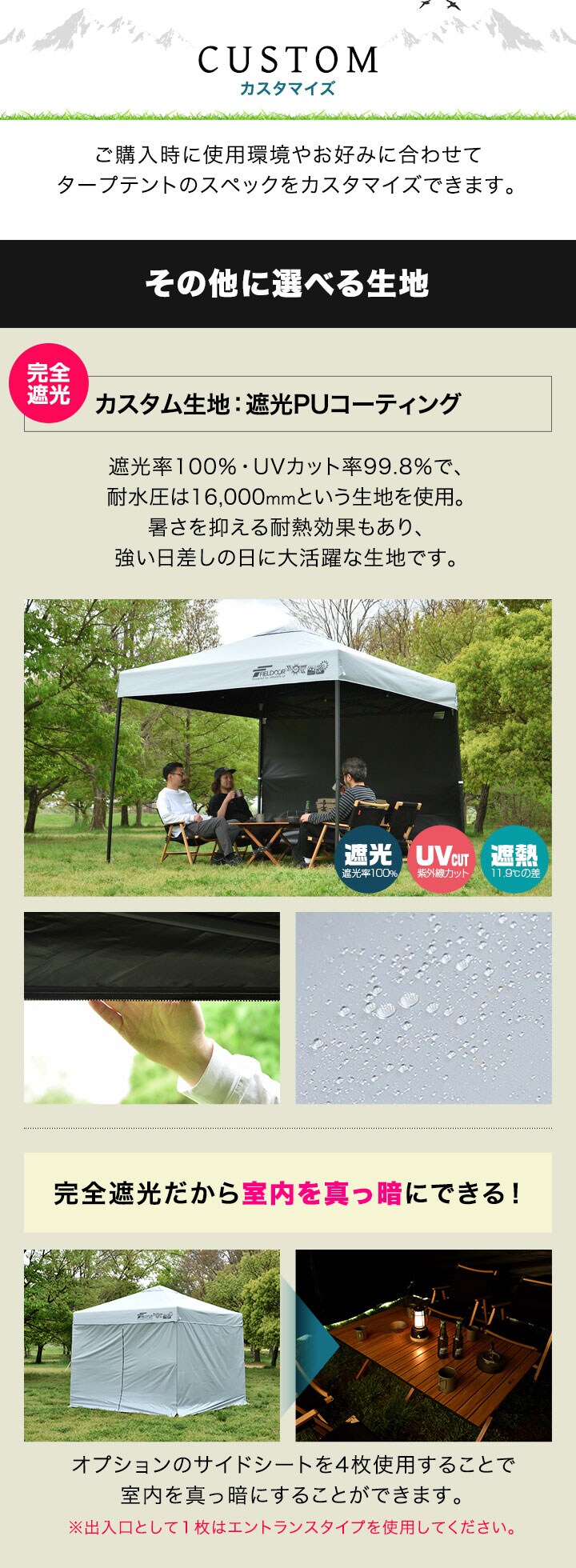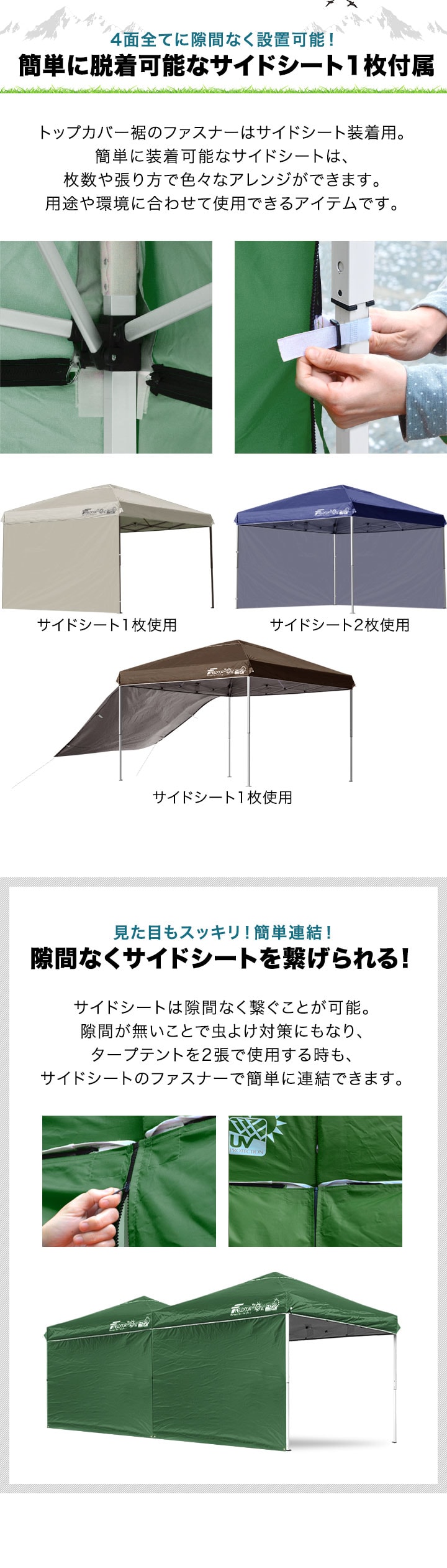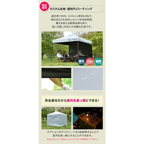 | 付属品: ・専用サイドシート(1枚) ・ロープ ・ペグ ・収納バッグ ・取扱説明書 |