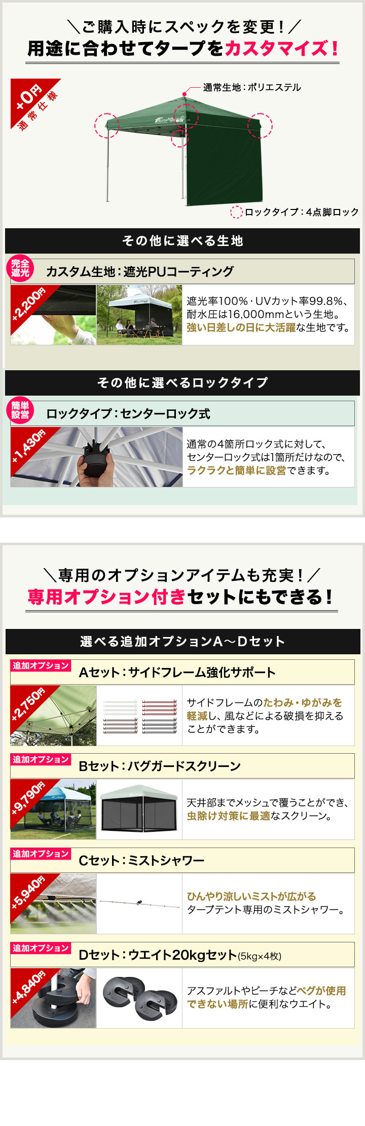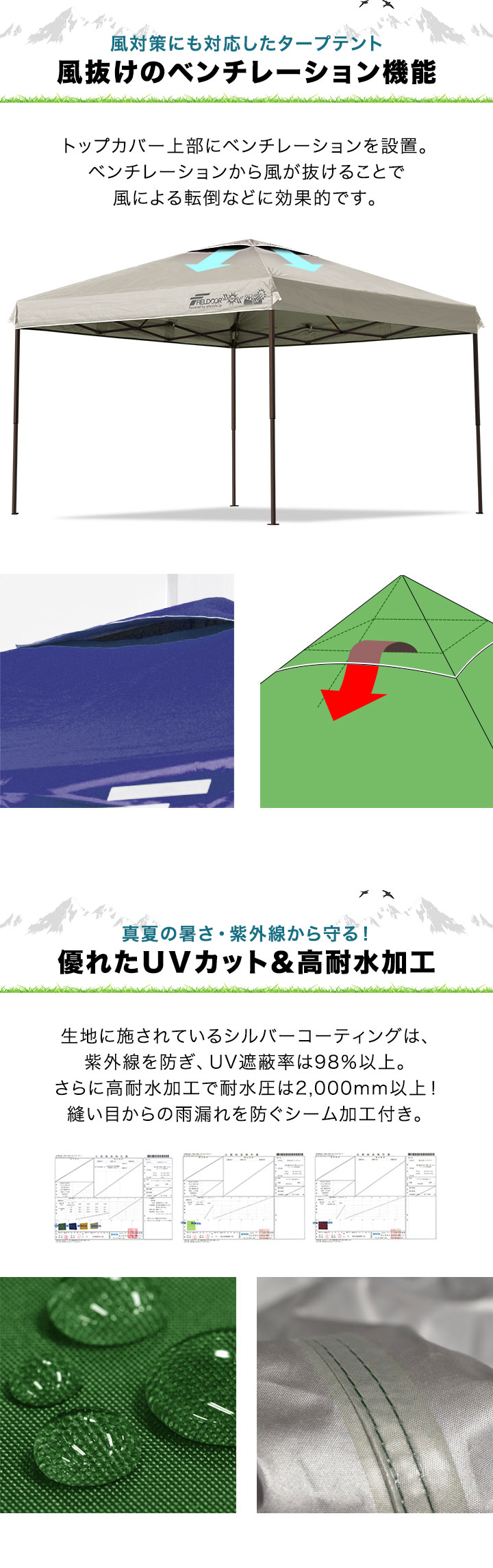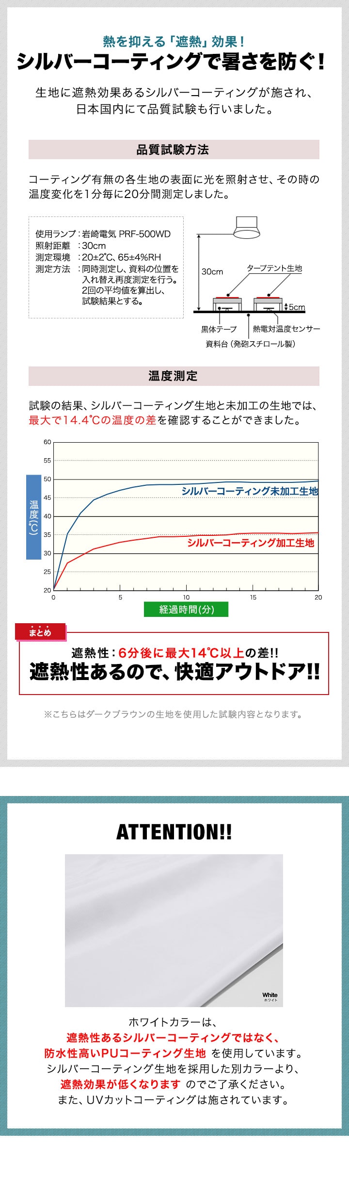 | 付属品: ・専用サイドシート(1枚) ・ロープ ・ペグ ・収納バッグ ・取扱説明書 |