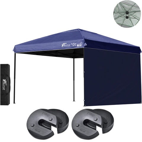 FIELDOOR ワンタッチタープテント 3m (遮光遮熱PU:ブルー/スチール/強化版サイドフレーム/4点脚ロック/Dウエイト4点付/サイドシート1枚付) 横幕セット タープ 300 ワンタッチテント ワンタッチタープ 大型 簡単 UVカット 撥水 日よけ アウトドア キャンプ 送料無料