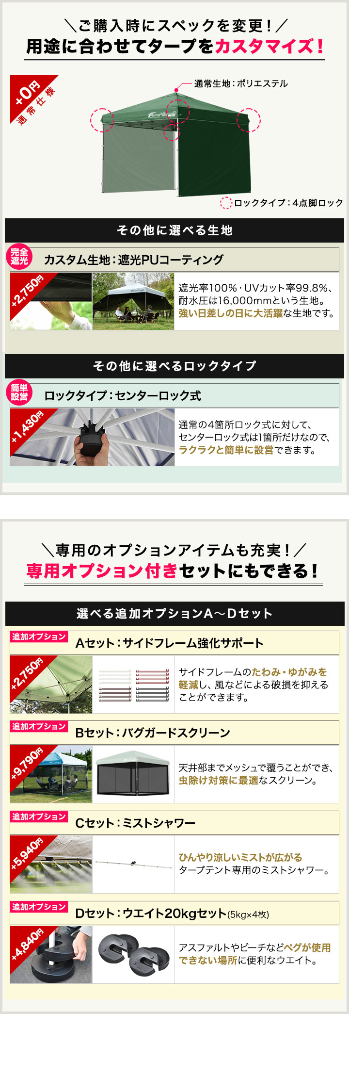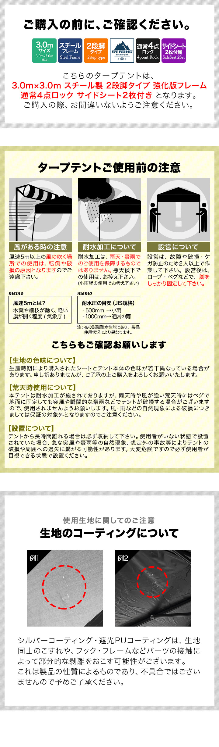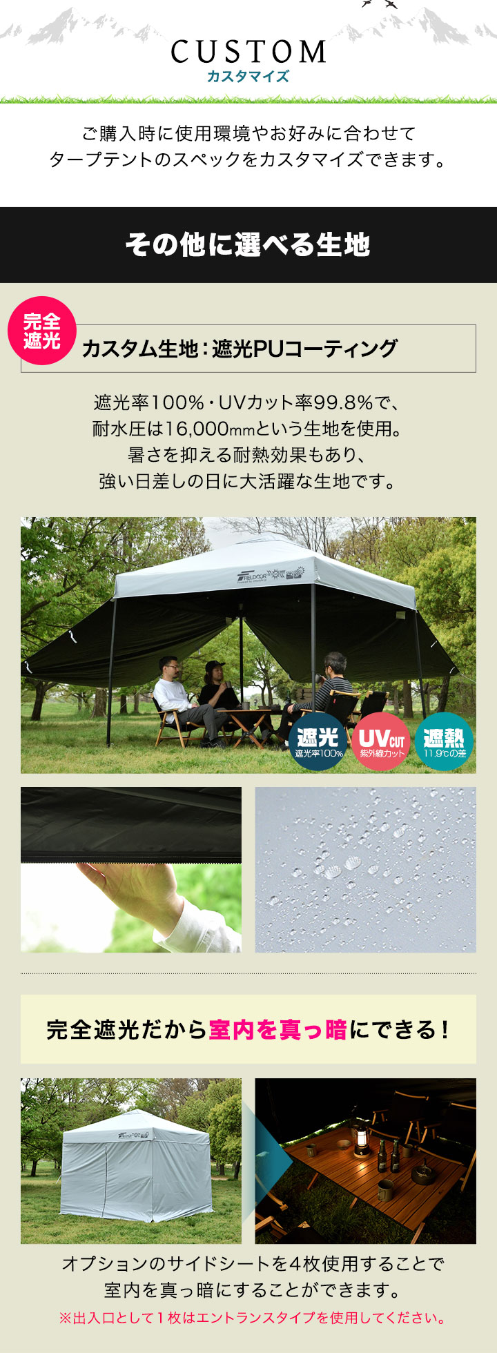 | 付属品: ・専用サイドシート(2枚) ・ロープ ・ペグ ・収納バッグ ・取扱説明書 |