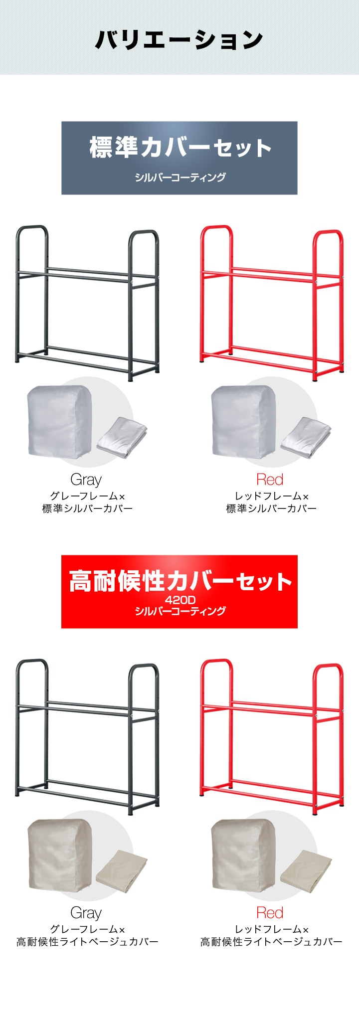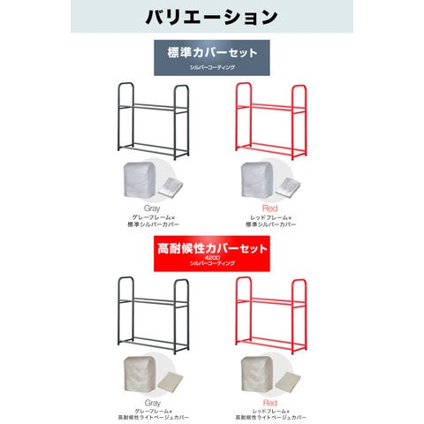 | カラー: 【標準カバーセット】(標準シルバーカバー) ・グレーフレーム ・レッドフレーム 【高耐候性カバーセット】(高耐候性ライトベージュカバー) ・グレーフレーム ・レッドフレーム |