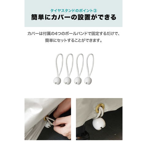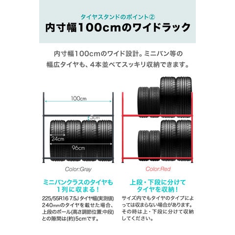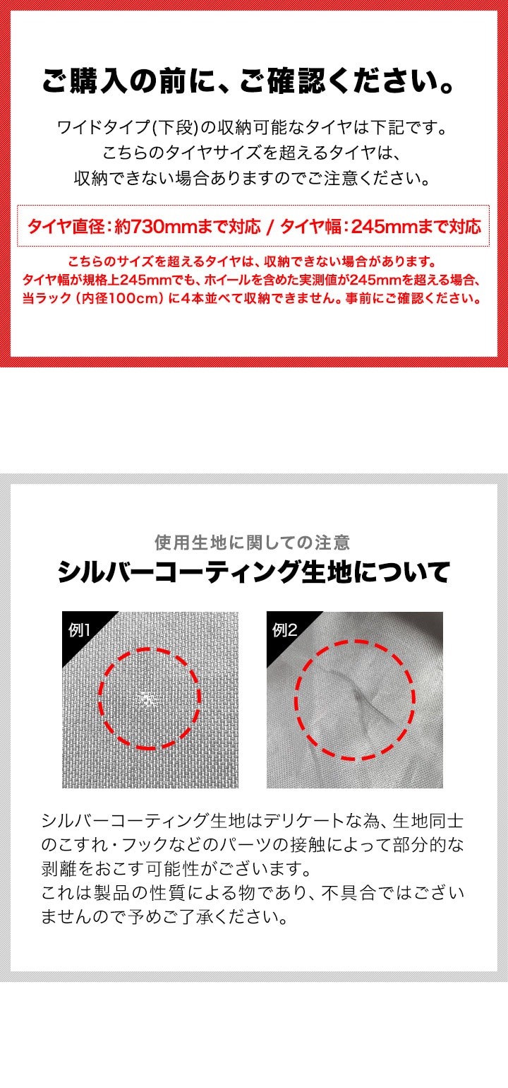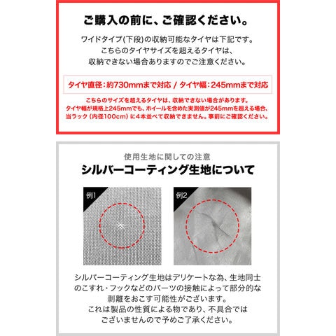 | 特記事項: ※こちらの商品はお客様組み立てとなります。(工具は付属しております。) ※直径73cm、タイヤ幅24.5cmを超えるタイヤには対応しておりません。 ※規格上24.5cmでも、ホイールを含む実測値が24.5cmを超える場合は、当ラック(内径100cm)に4本収納できない可能性があります。ご購入前にご確認ください。 |