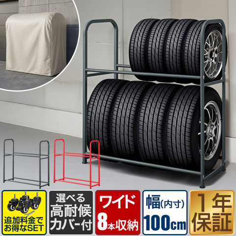 タイヤラック 8本 カバー付き 2段 (グレー/標準カバー/キャスター付き) 縦置き ワイド 100cm タイヤスタンド ワイドタイプ タイヤ収納ラック タイヤラックカバー 厚手 タイヤ交換 タイヤ保管 スタッドレス 冬タイヤ 屋外 物置 頑丈 送料無料
