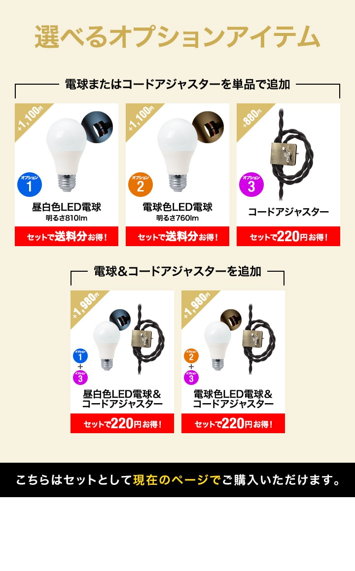| 特記事項: ※コードの長さ調整はできません。 ※接続プラグ部分のカラーは共通でホワイトです。 ※照明のオン/オフはお部屋の壁面スイッチで操作してください。 |