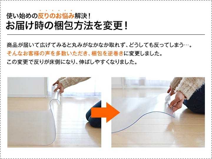 | ※お手入れは薄めた中性洗剤を湿らした布につけ、固く絞って拭いた後、水分が残らないように乾いた布で乾拭きしてください。 ※日の当たる所で使用しないでください。日焼けで硬化する場合があります。 ※寒暖により長さに変化が生じる可能性がございます。 ※商品は、モニターによって色合いが異なって見える場合があります。 ※仕様・デザインは改良のため予告なく変更することがあります。 |