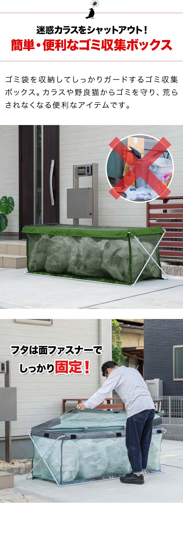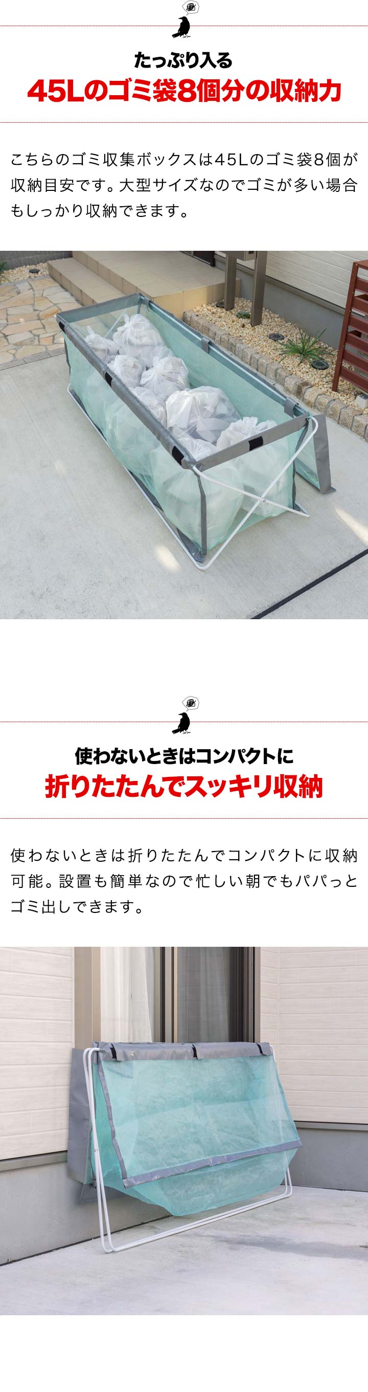 | 安全上のご注意: ・生活ゴミや資源ゴミの一時置き以外の目的では使用しないでください。 ・火気や高温物に近づけたり放置しないでください。 ・平らな面で、がたつきのない安定した状態で使用してください。 ・内容物を入れたまま引きずらないでください。底部の破損に繋がります。 ・台風などの予測できない強風が発生する場合は、使用を控えてください。風で飛ばされるおそれがあります。 ・鋭利な形状のものを入れると破損のおそれがあります。 ・無理に大きなものを入れたり、詰め過ぎにはご注意ください。 ・汚れた場合は、固く絞ったスポンジや布で汚れを拭き取ってください。 ・直接日光が当たらない場所で保管してください。製品劣化の原因となります。 ・安全上、破損した場合は使用しないでください。 ・廃棄の際は、各地方自治体のルールに従ってください。 |